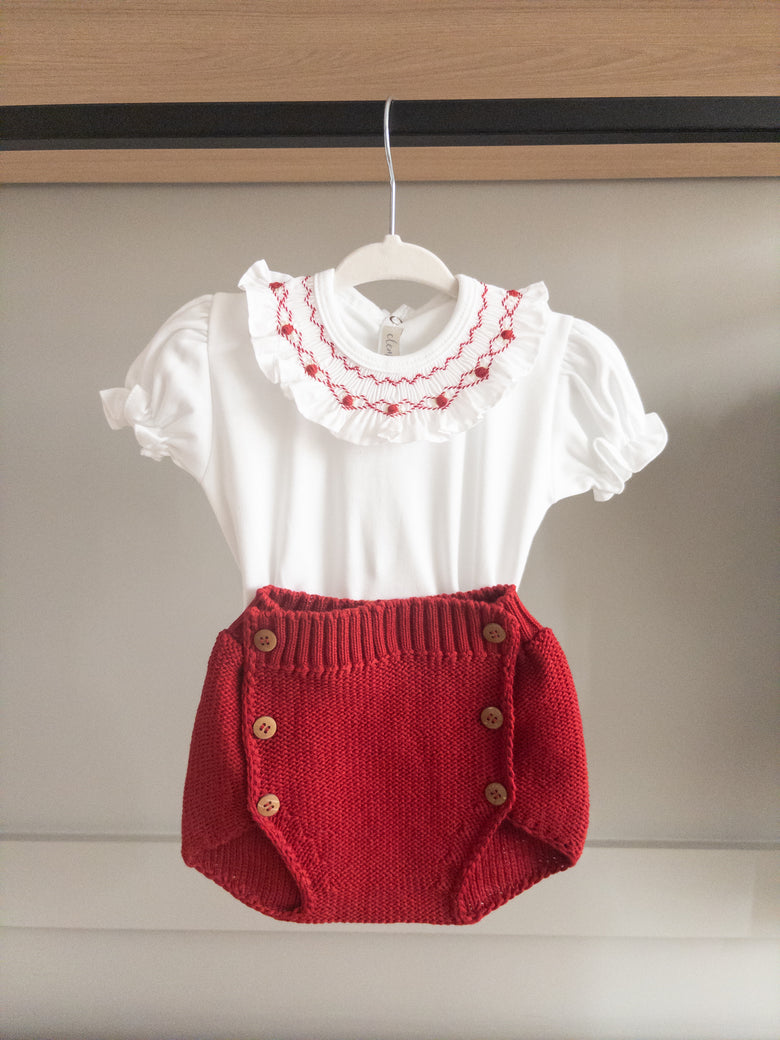 This bloomer/diaper cover features charming wooden buttons, adding a touch of personality and charm to the piece. Paired with a smocked bodysuit in soft yellow tones, it's the perfect look—full of style and sweetness. Ideal for special occasions or simply to add an enchanting touch to your little princess's day.