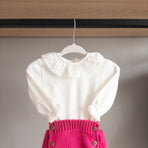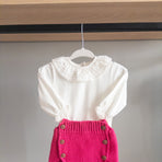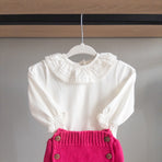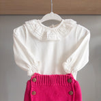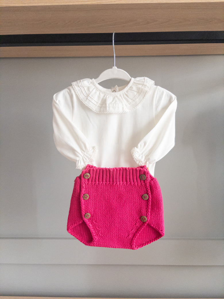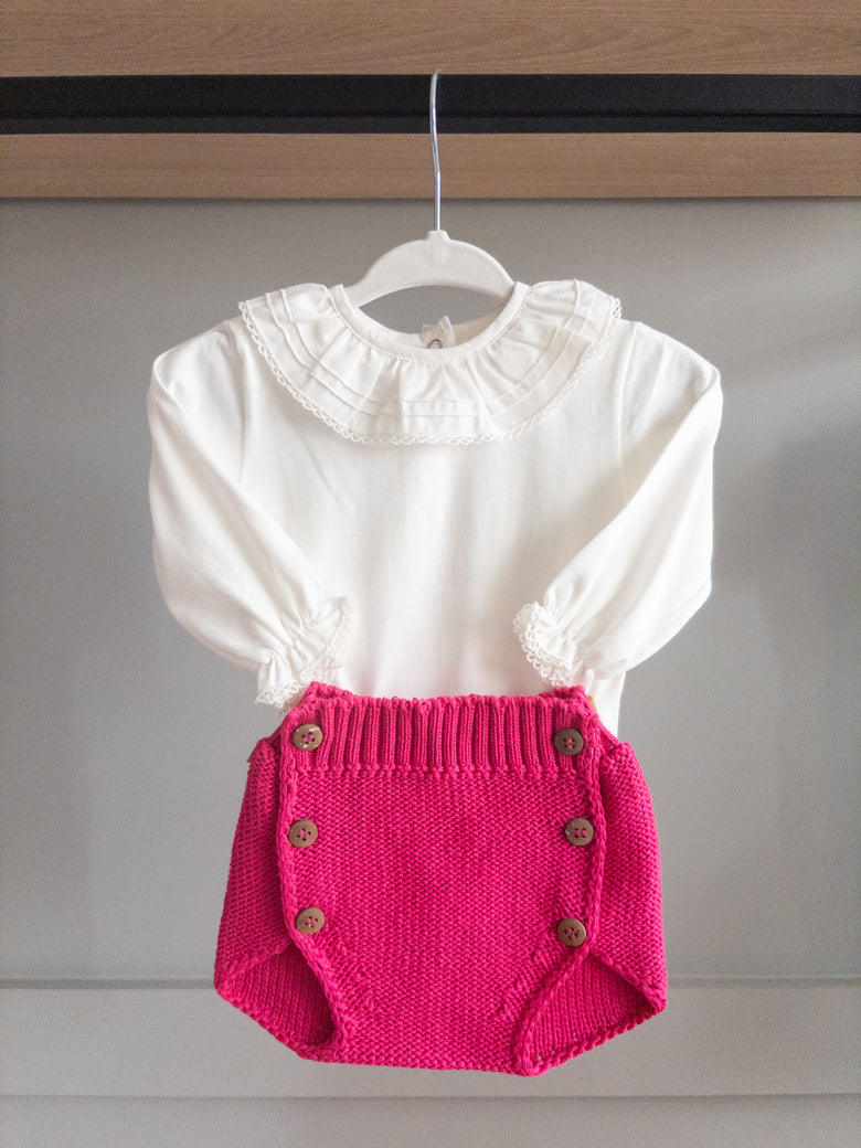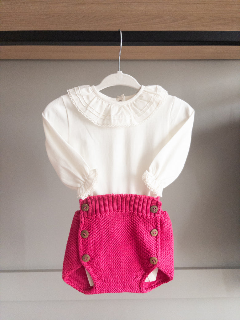 This bloomer/diaper cover features charming wooden buttons, adding a touch of personality and charm to the piece. Paired with a smocked bodysuit, it's the perfect outfit full of style and delicacy, it's the perfect look—full of style and sweetness. Ideal for special occasions or simply to add an enchanting touch to your little princess's day.