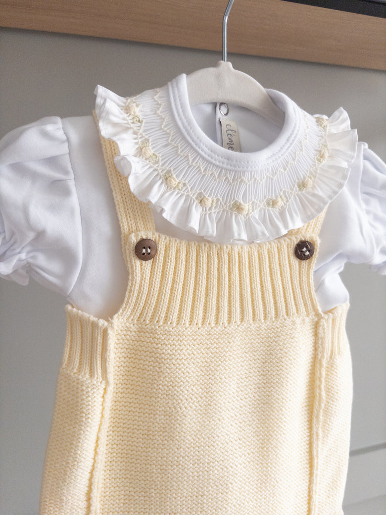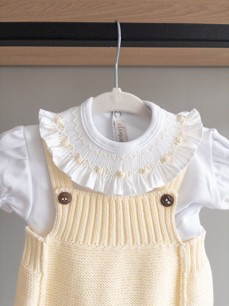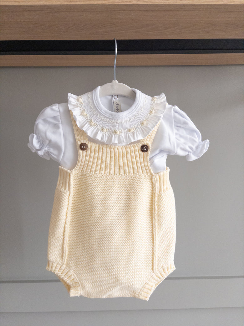 This bloomer/diaper cover features charming wooden buttons, adding a touch of personality and charm to the piece. Paired with a smocked bodysuit in soft yellow tones, it's the perfect look—full of ...