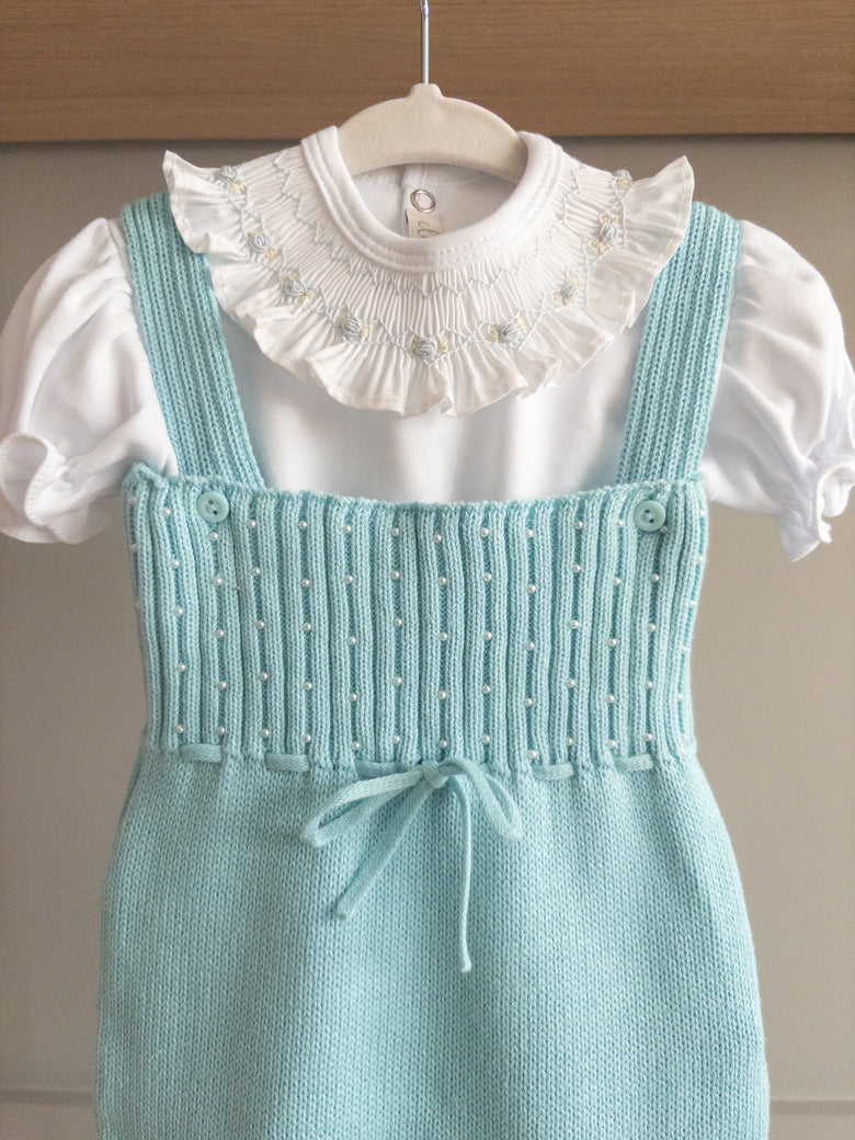 Made from soft, breathable knit fabric, it ensures complete comfort for your little one. The design features delicate pearls adorning the front, along with a lovely bow that adds an extra dash of charm.
