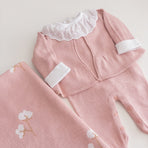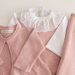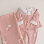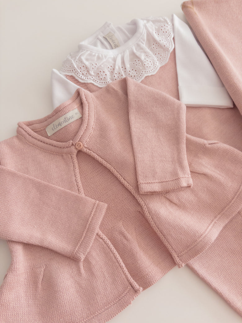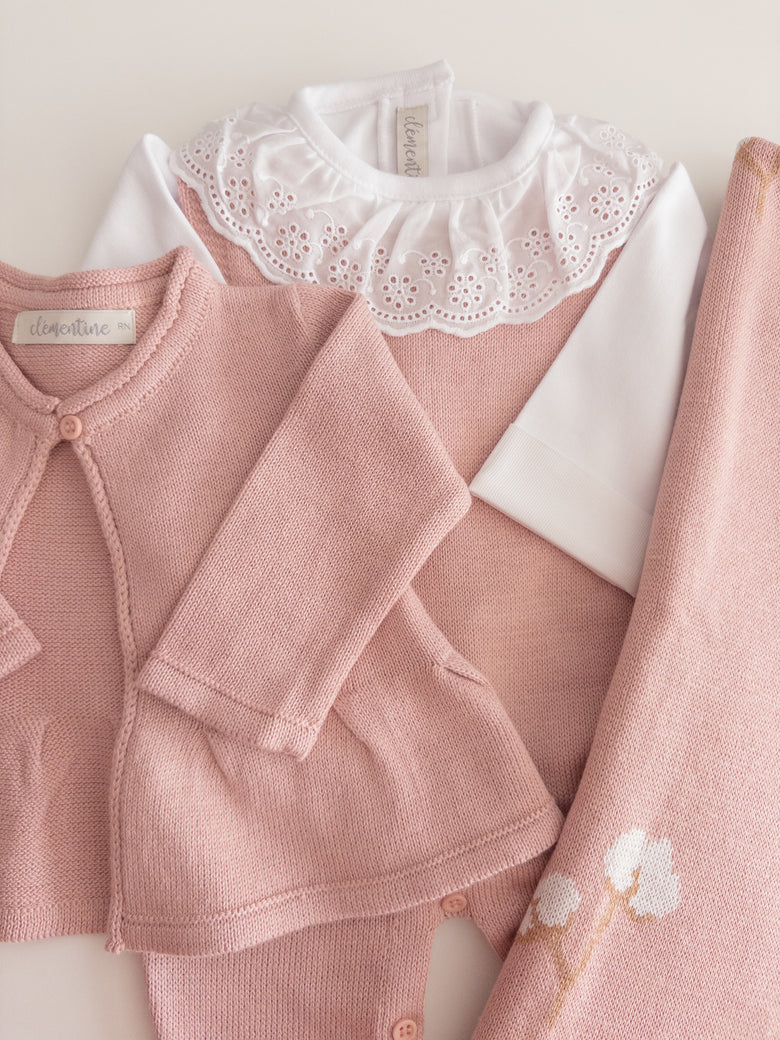 Floribella Maternity Coming-Home Set. The little cardigan showcases charming buttons in a stunning tone, intertwining like visual poetry.