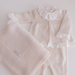 Solar Maternity Coming Home Set.This beautiful set includes a soft knitted outfit featuring delicate butterfly embroidery, adding a gentle and elegant touch to the look. Paired with a lace-trimmed ...
