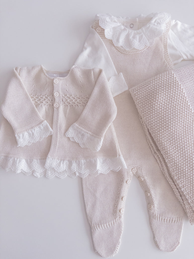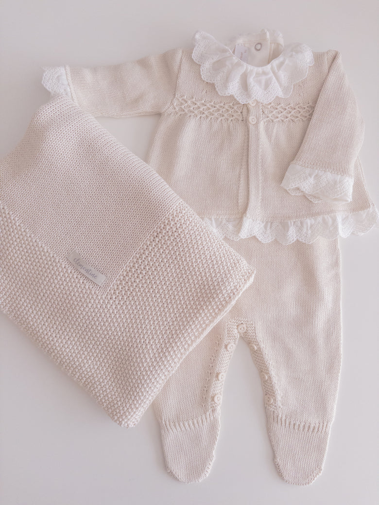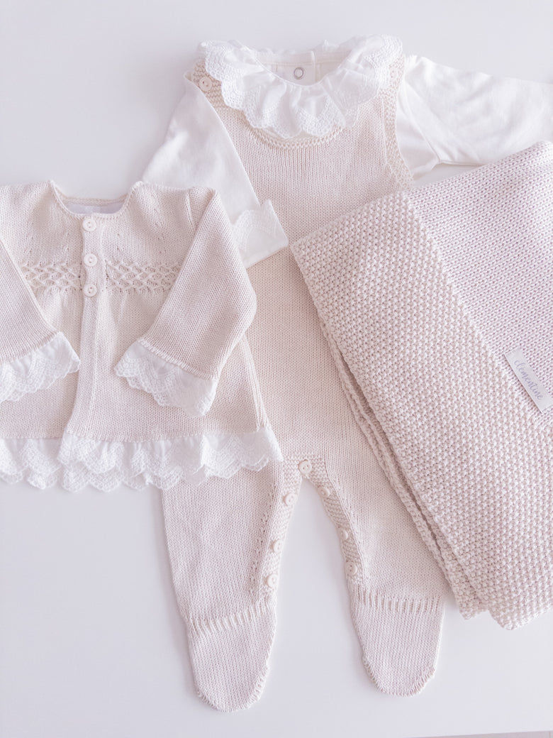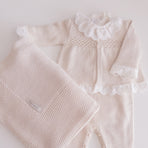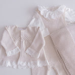 Cecília Newborn Coming Home Set, adorned with delicate details that capture the essence of purity and love. The elegant touch of lace and the charming bow complete the design, creating a cozy and e...