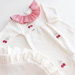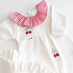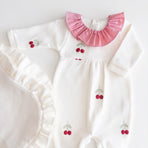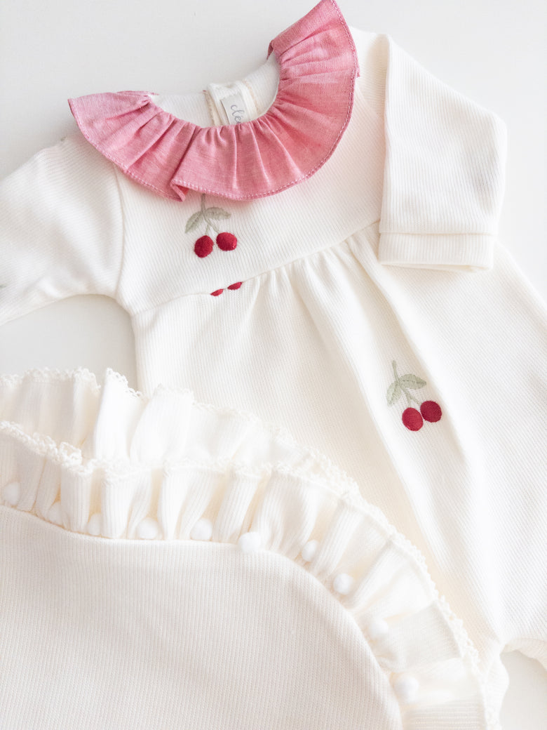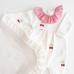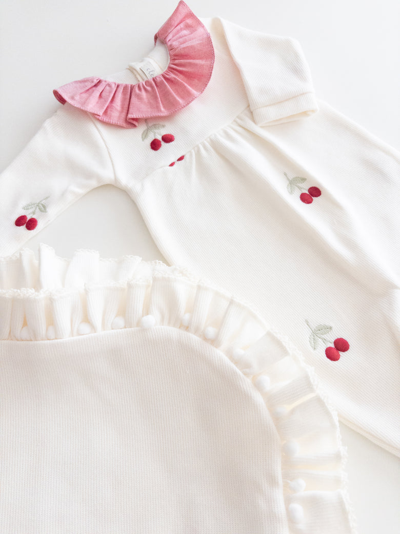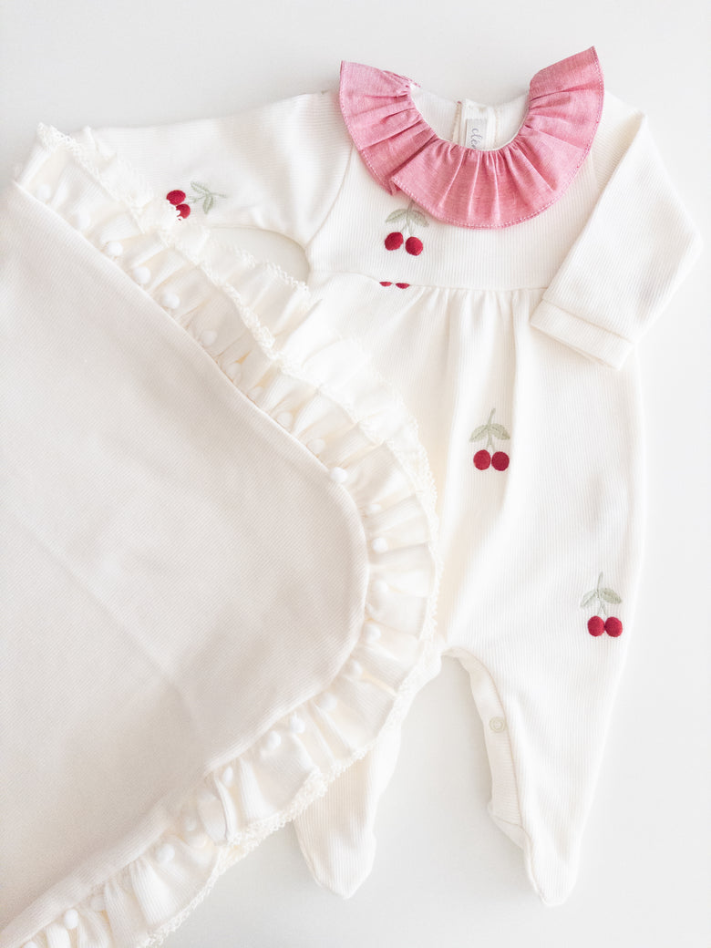 Enchant everyone with the elegance and delicacy of our Cherry maternity set, made from 100% cotton. The set includes a jumpsuit featuring a delicate cherry embroidery and a blanket with polka dots that evoke purity and tenderness. The jumpsuit combines practicality with style, while the blanket gently wraps your baby in softness and warmth, making it perfect for those first moments together. This set not only celebrates your little one’s arrival with elegance but also creates precious memories you’ll cherish forever.