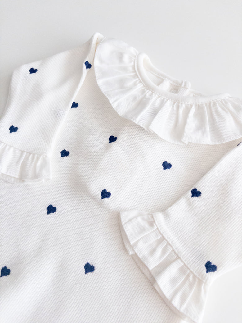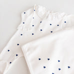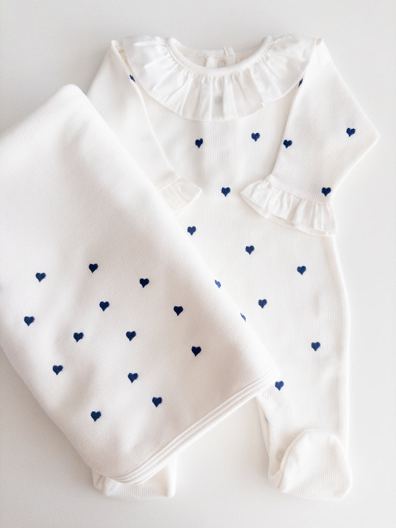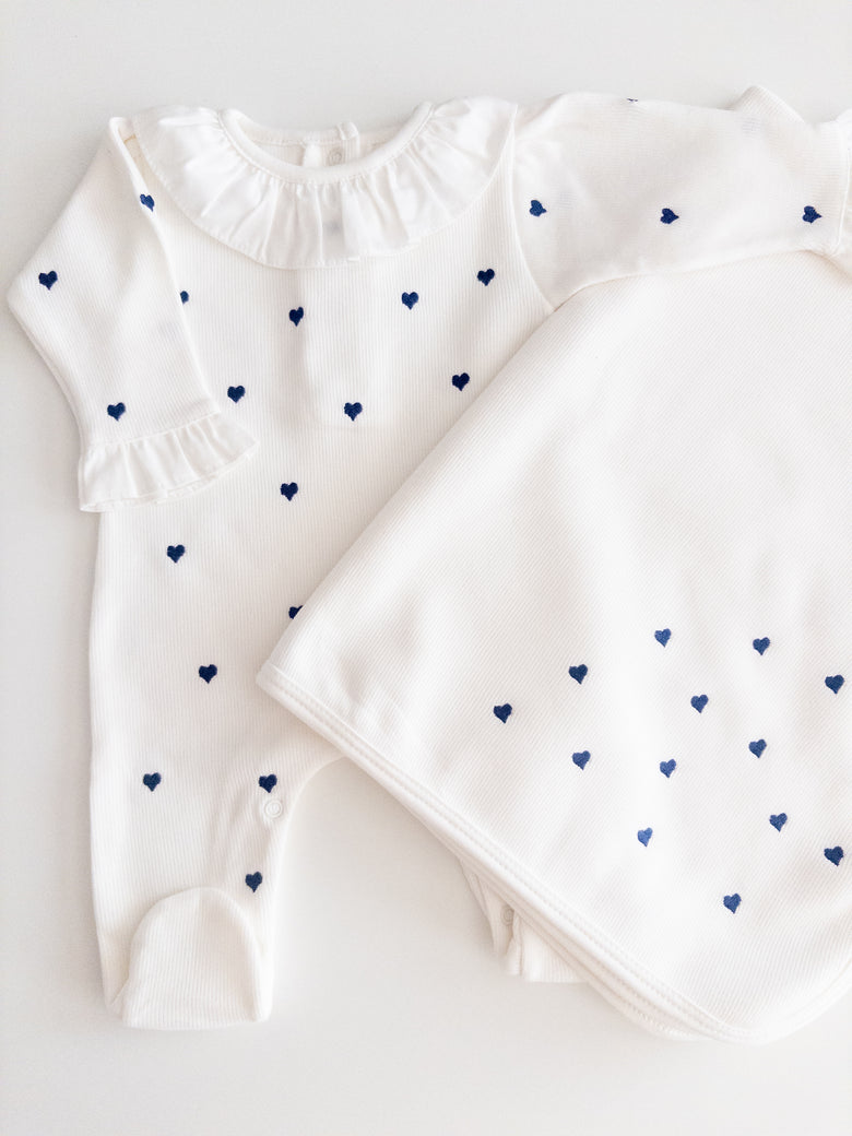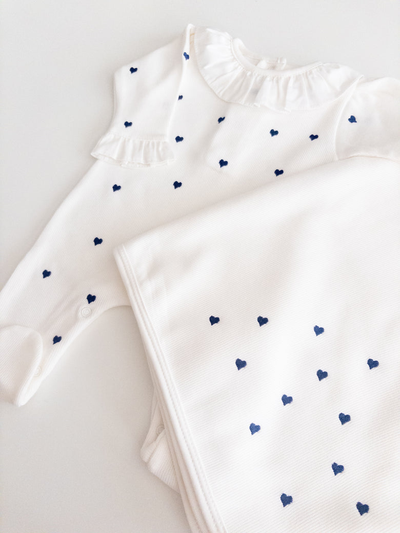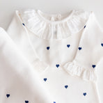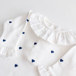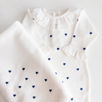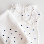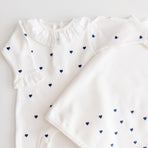1 off-white Emma romper with navy blue hearts