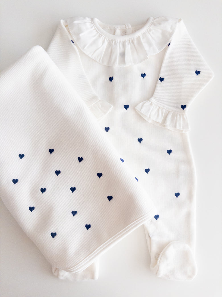 Enchant everyone with the elegance and delicacy of our Emma newborn take-home set, made from 100% cotton. The set includes a romper with delicate embroidered hearts and a matching blanket, evoking purity and tenderness. The romper combines practicality with style, while the blanket wraps your baby in softness and warmth — perfect for those first precious moments together. This set not only celebrates your little one’s arrival with grace but also creates beautiful memories to cherish forever.
