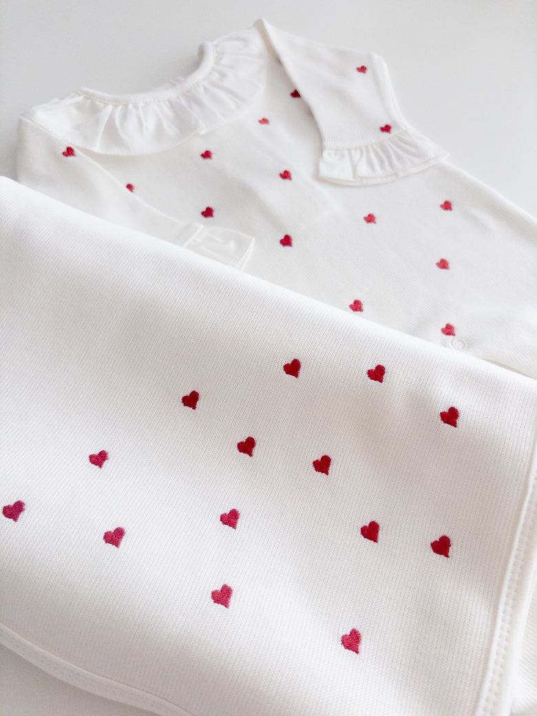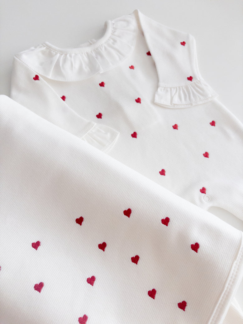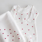 Enchant everyone with the elegance and delicacy of our Emma newborn take-home set, made from 100% cotton. The set includes a romper with delicate embroidered hearts and a matching blanket, evoking purity and tenderness. The romper combines practicality with style, while the blanket wraps your baby in softness and warmth — perfect for those first precious moments together. This set not only celebrates your little one’s arrival with grace but also creates beautiful memories to cherish forever.