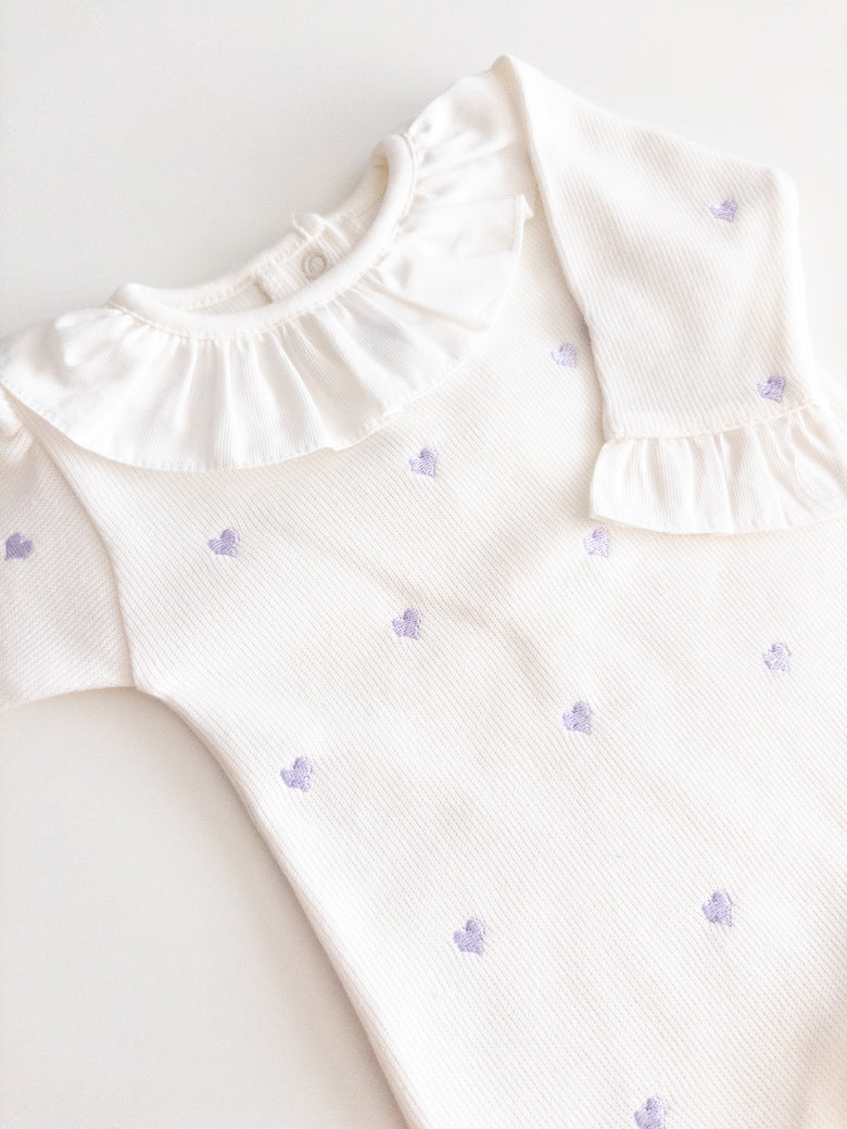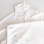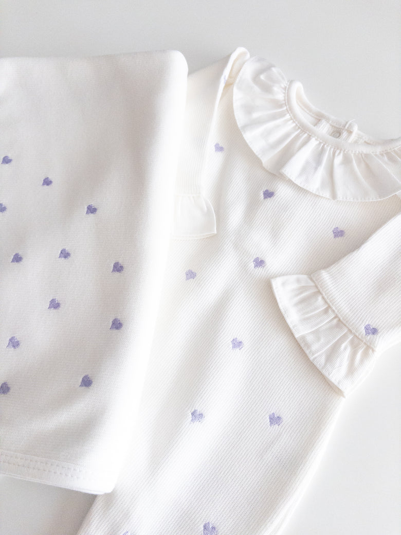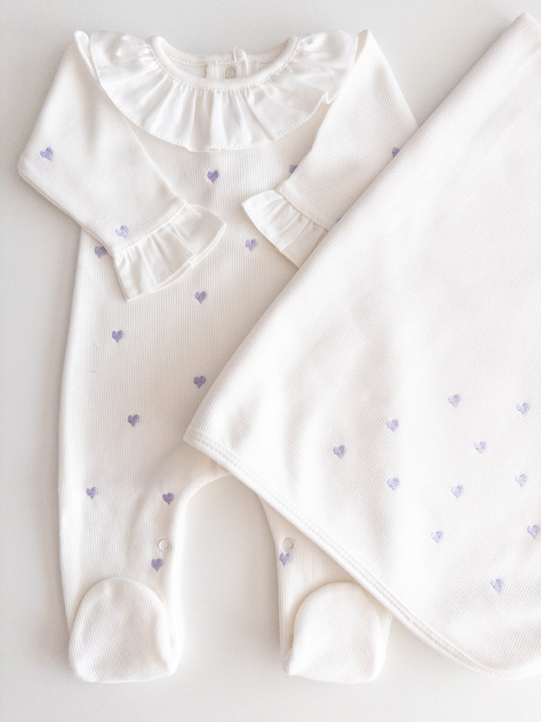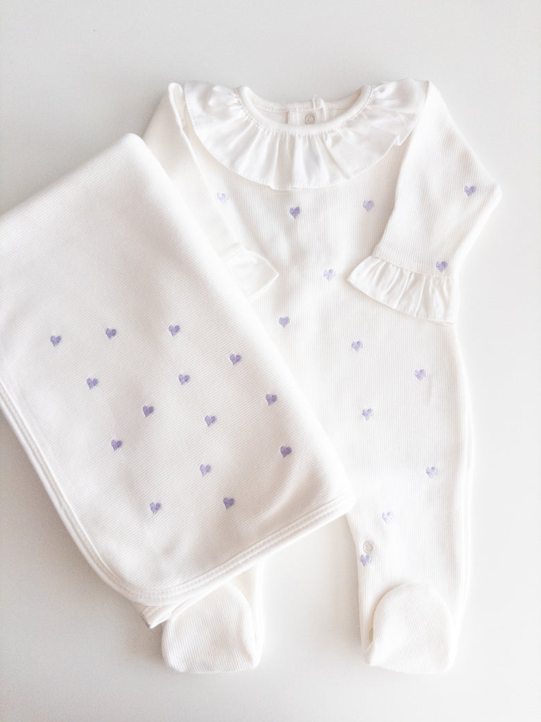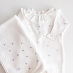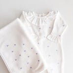 Enchant everyone with the elegance and delicacy of our Emma newborn take-home set, made from 100% cotton. The set includes a romper with delicate embroidered hearts and a matching blanket, evoking purity and tenderness. The romper combines practicality with style, while the blanket wraps your baby in softness and warmth — perfect for those first precious moments together. This set not only celebrates your little one’s arrival with grace but also creates beautiful memories to cherish forever.