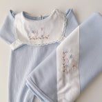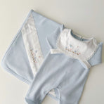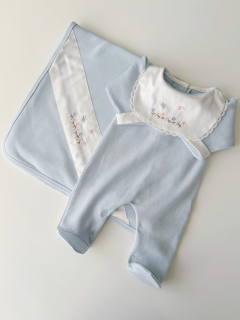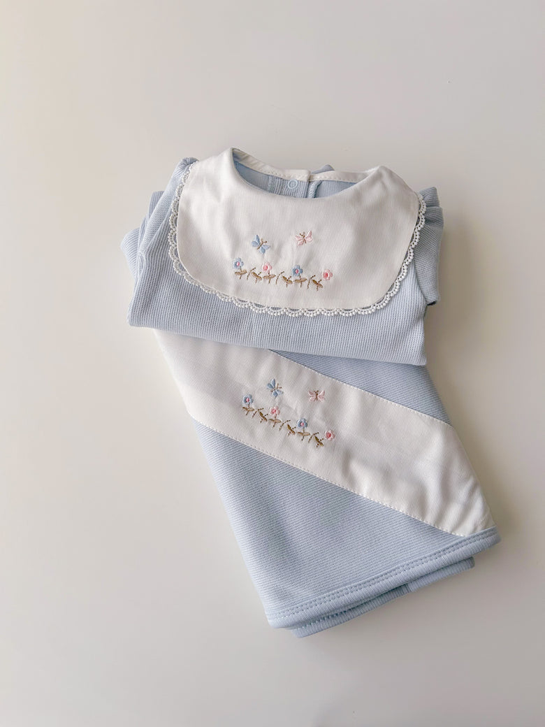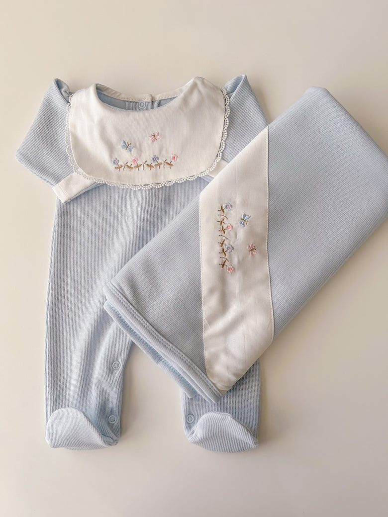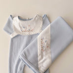 Adorned with floral embroidery that evokes purity and tenderness, every detail of this set has been carefully chosen. Accompanied by a matching blanket embroidered with delicate flowers, it offers both comfort and style—ensuring your baby is always cozy and beautifully dressed. Perfect for unforgettable first moments and cherished memories.