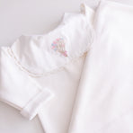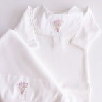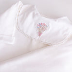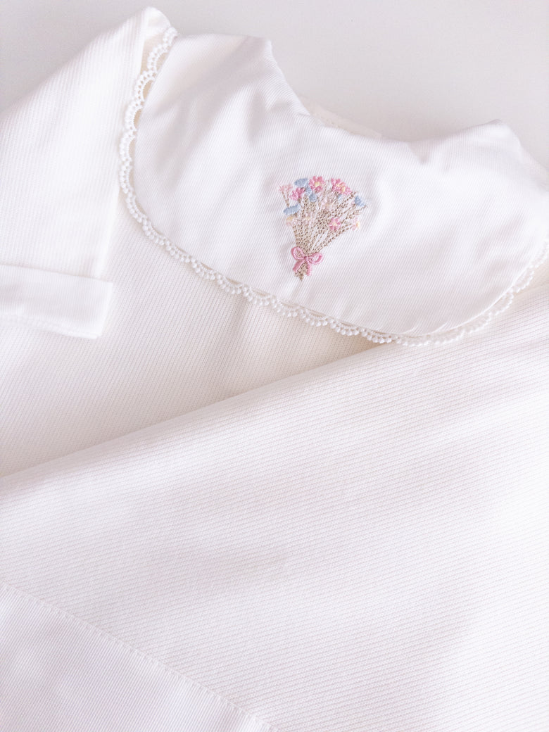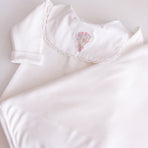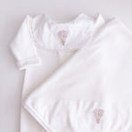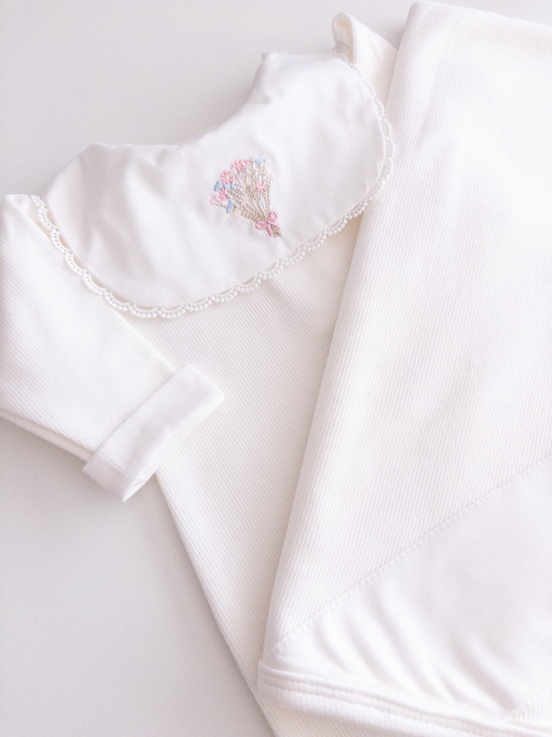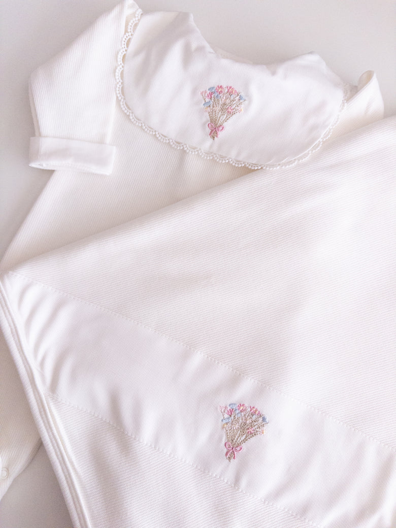 Adorned with floral embroidery that evokes purity and tenderness, every detail of this set has been carefully chosen. Accompanied by a matching blanket embroidered with delicate flowers, it offers both comfort and style—ensuring your baby is always cozy and beautifully dressed. Perfect for unforgettable first moments and cherished memories.