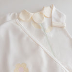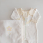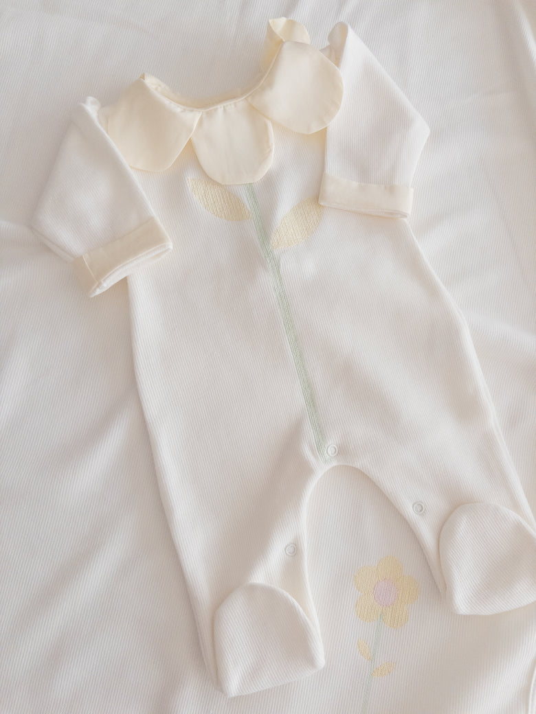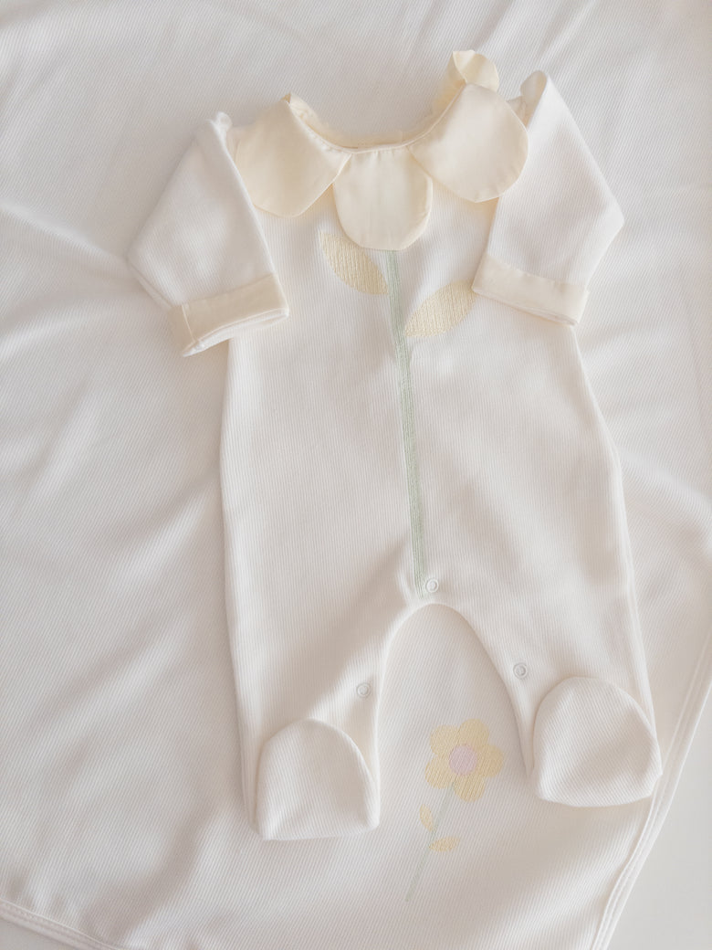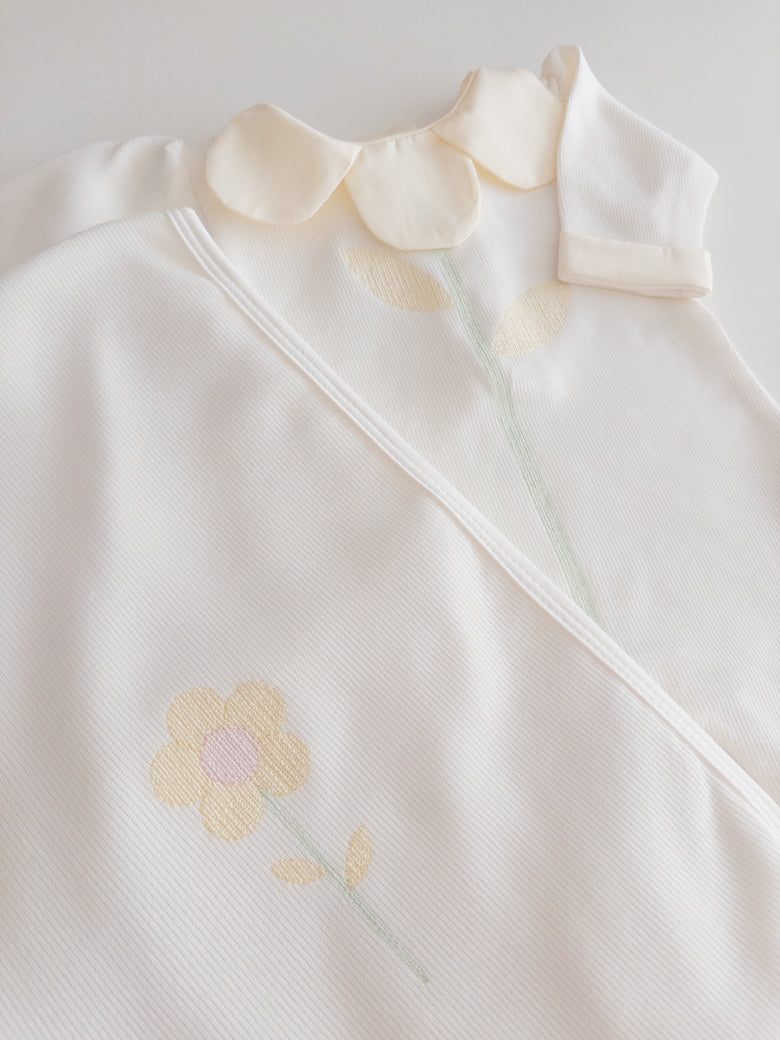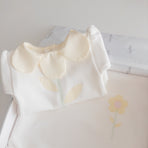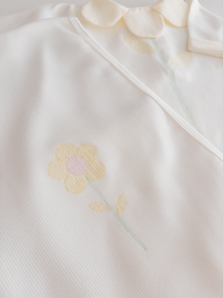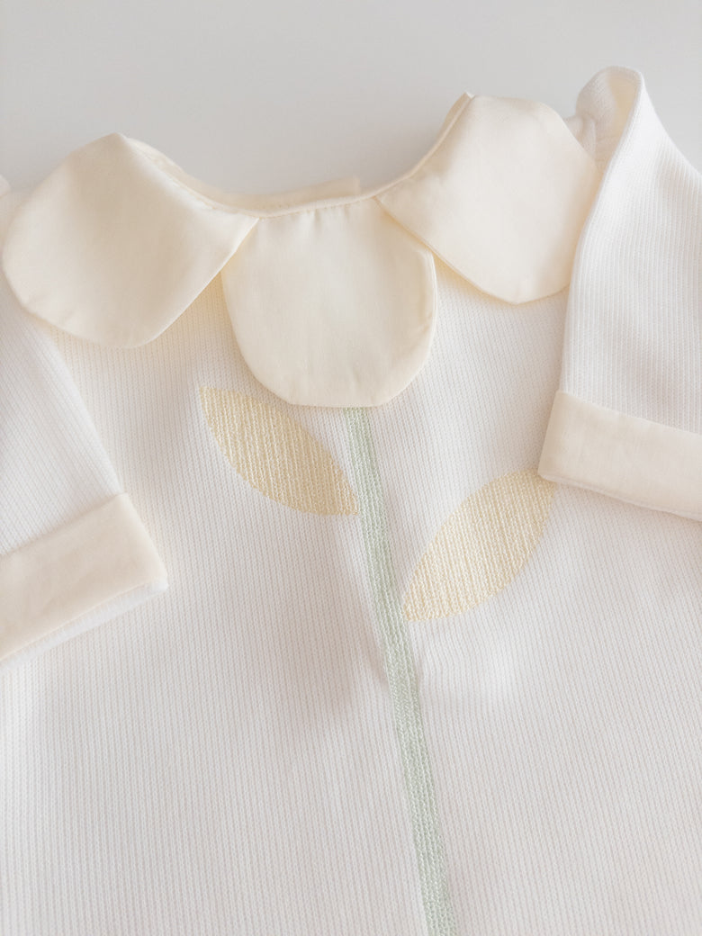 Crafted from soft, breathable fabric, it offers all-day comfort. The highlight is the floral embroidery on the front, adding a touch of elegance and a sweet detail to the look. The petal-shaped collar completes the outfit with extra charm, creating a unique and enchanting style.