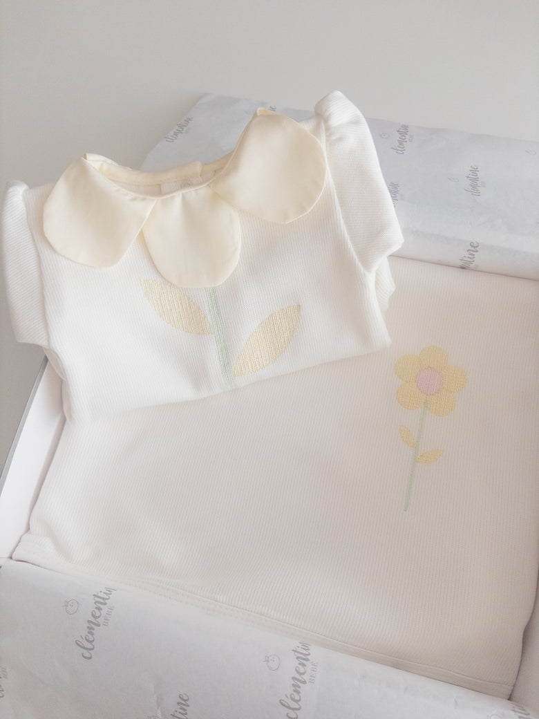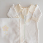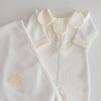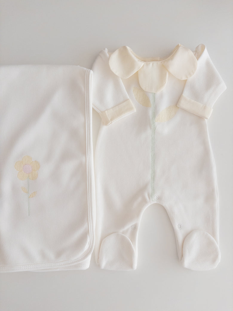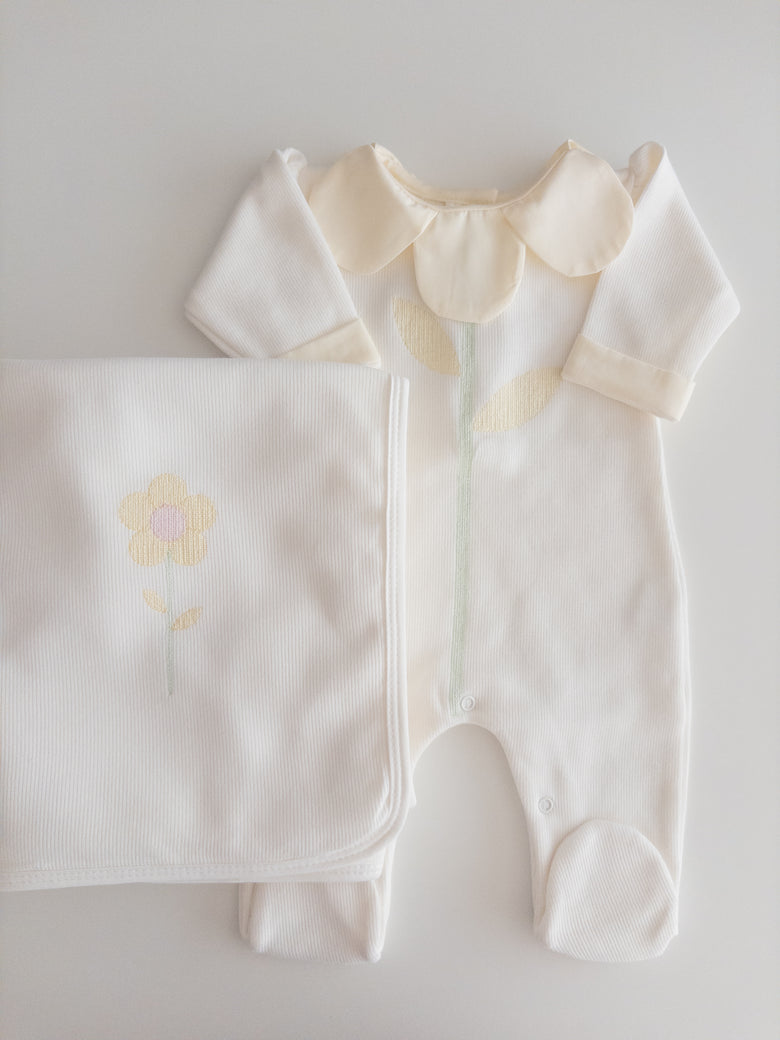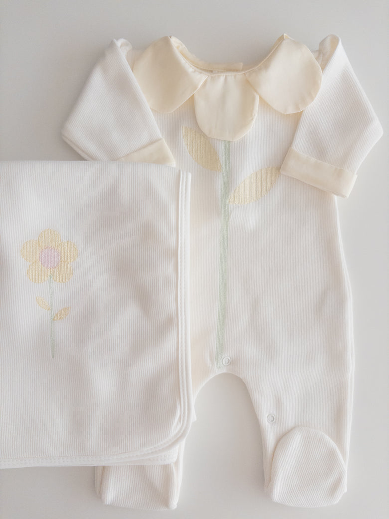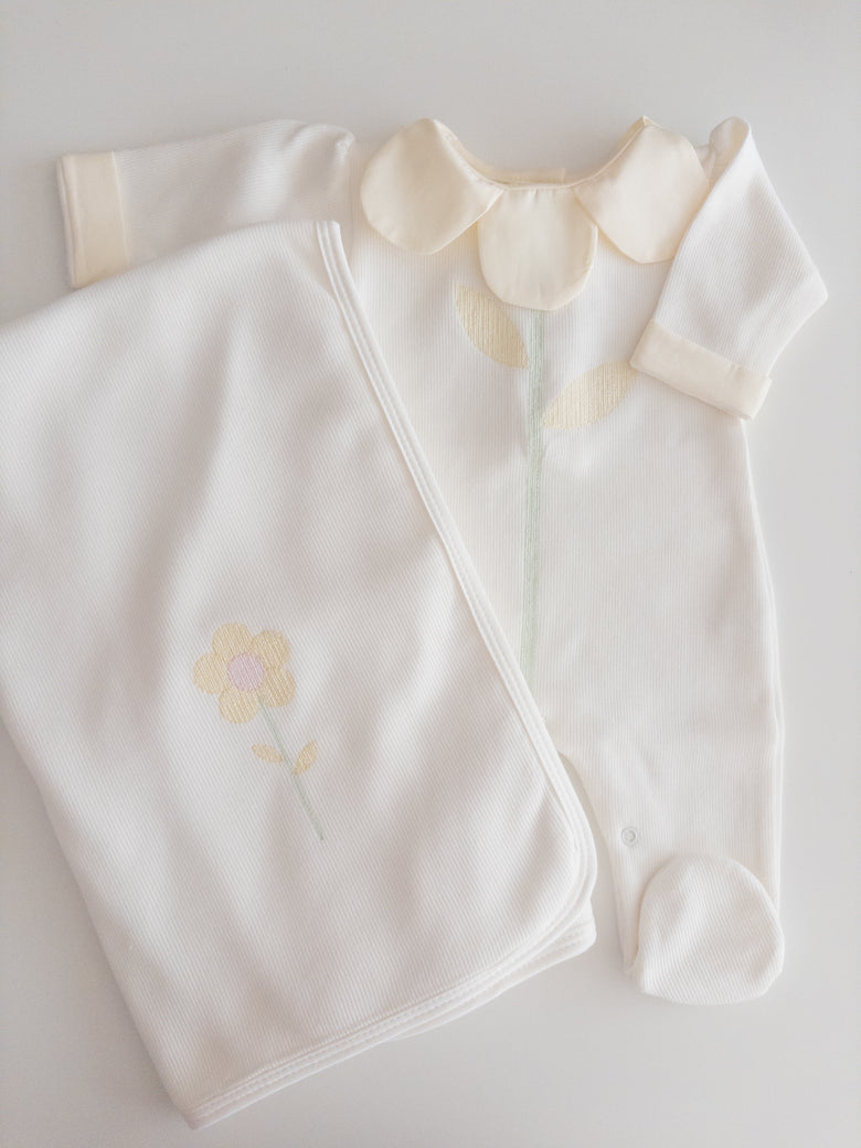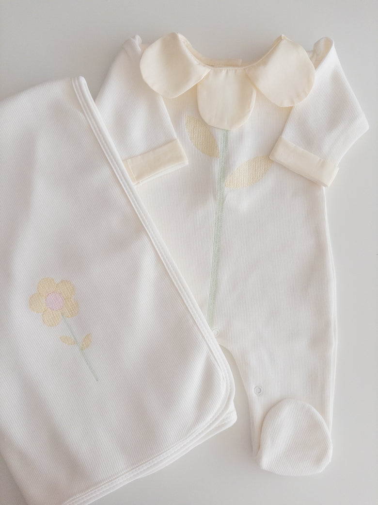 Accompanied by a blanket adorned with matching floral embroidery, it ensures your baby stays cozy and beautifully dressed. Perfect for unforgettable introductions and heartwarming memories.