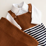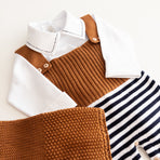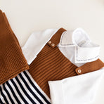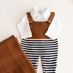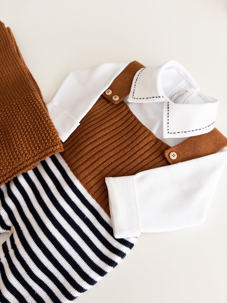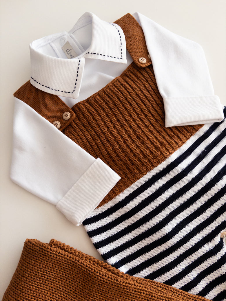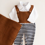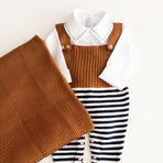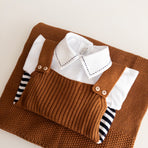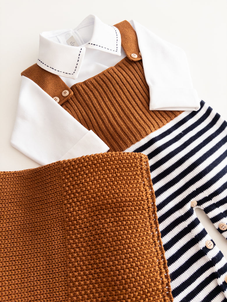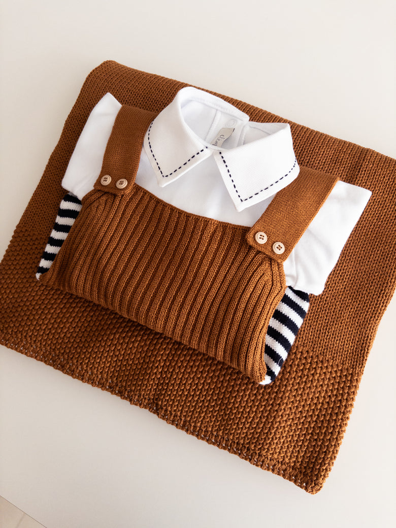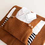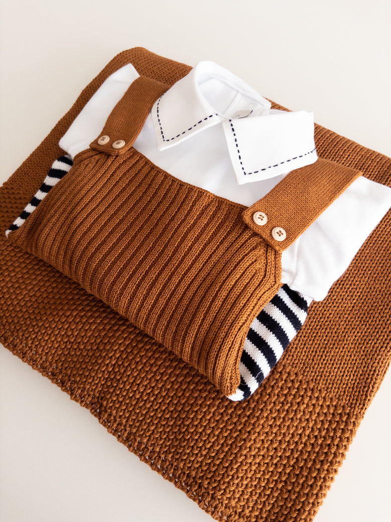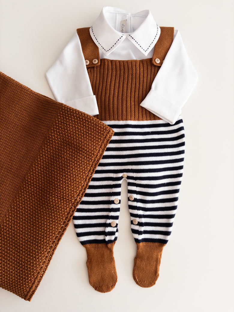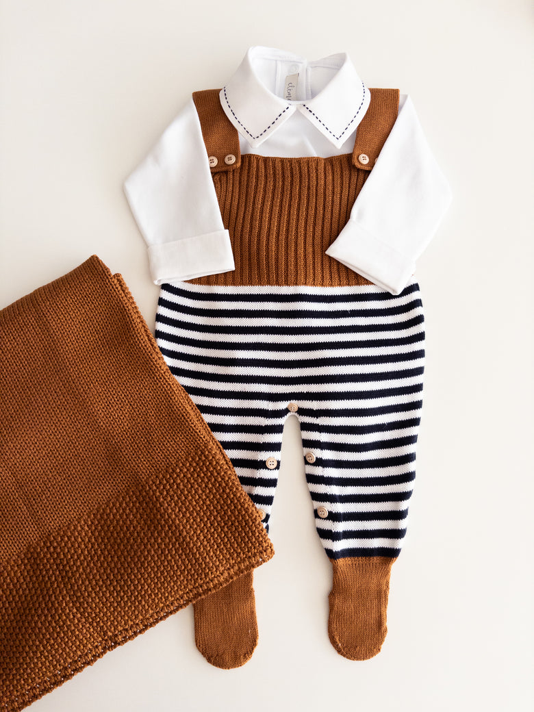 Charming Coming-Home Set, featuring a caramel knit romper with deep blue stripes, perfectly paired with an elegant bodysuit finished with navy trim. A matching caramel knitted blanket completes the look. Perfect for your baby's first cozy moments.