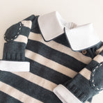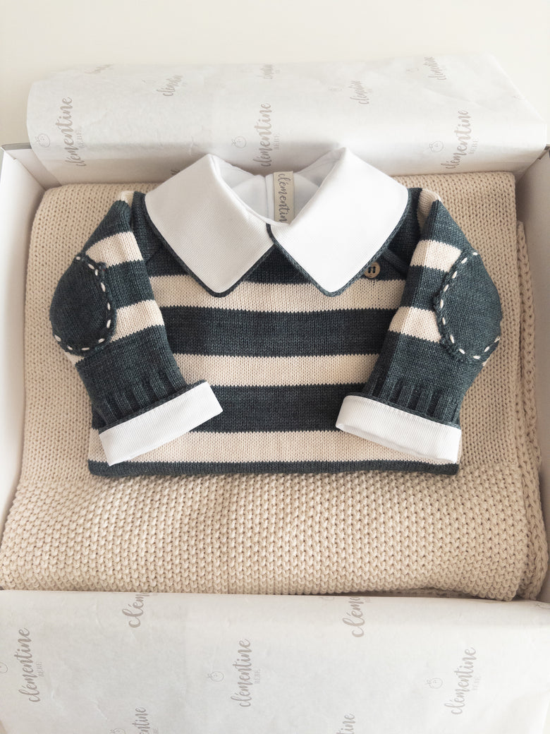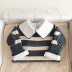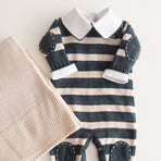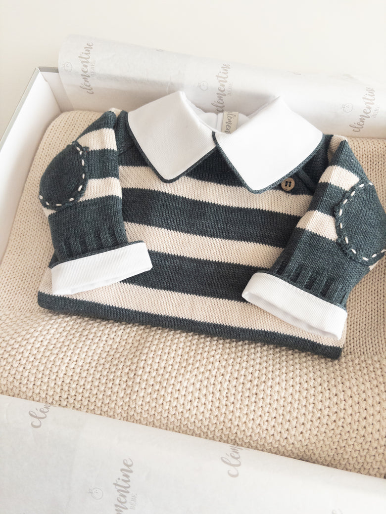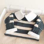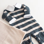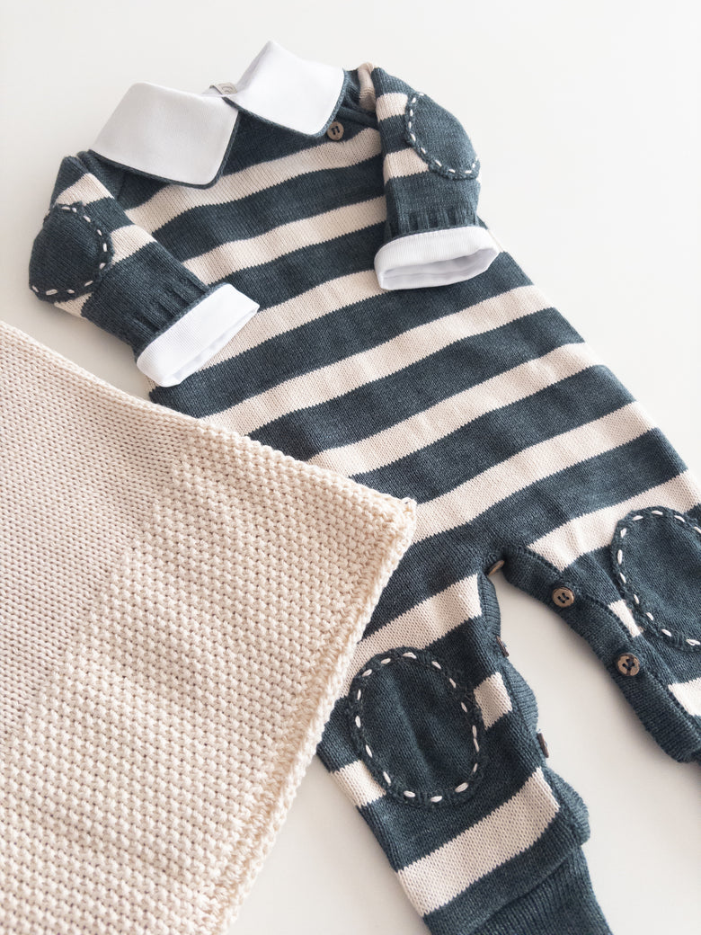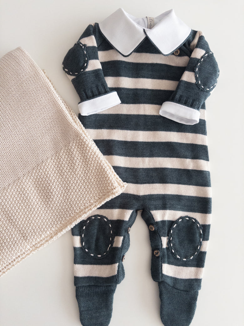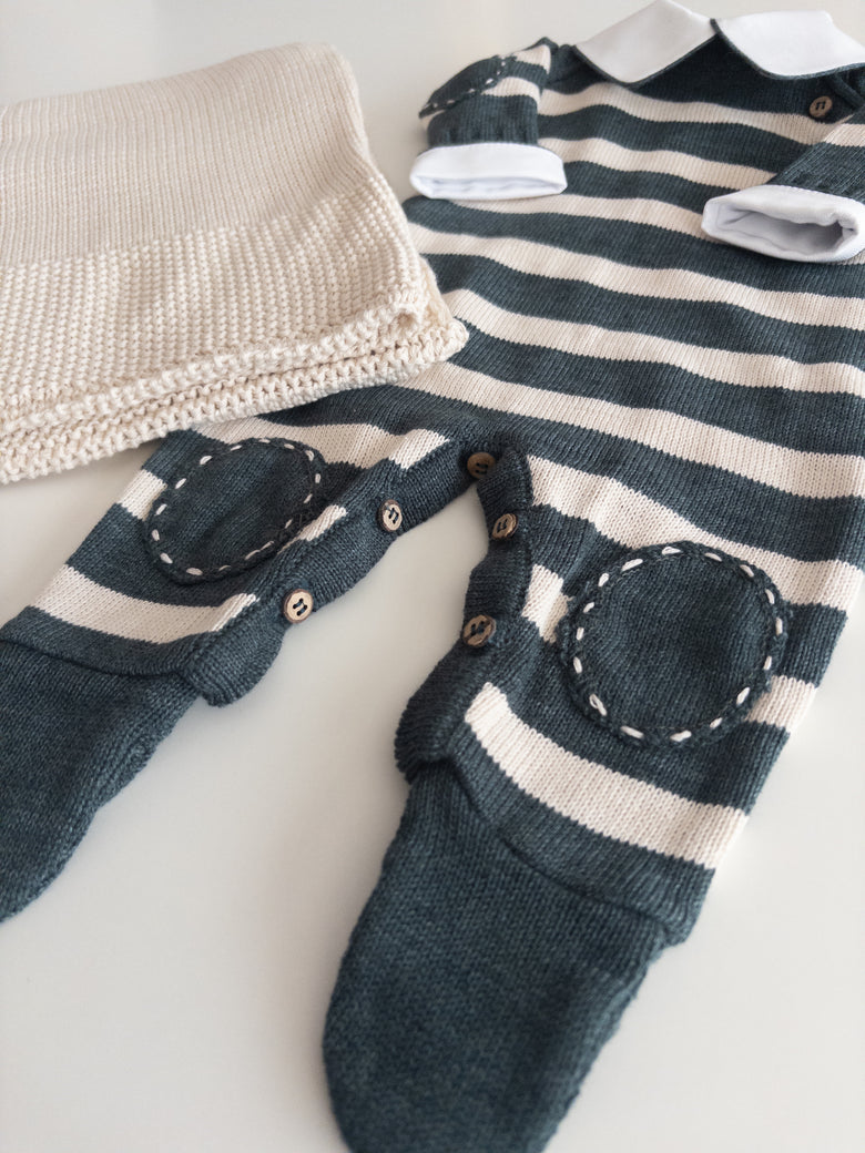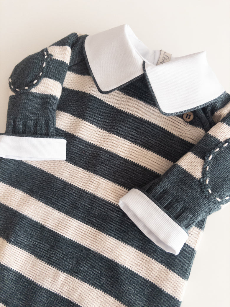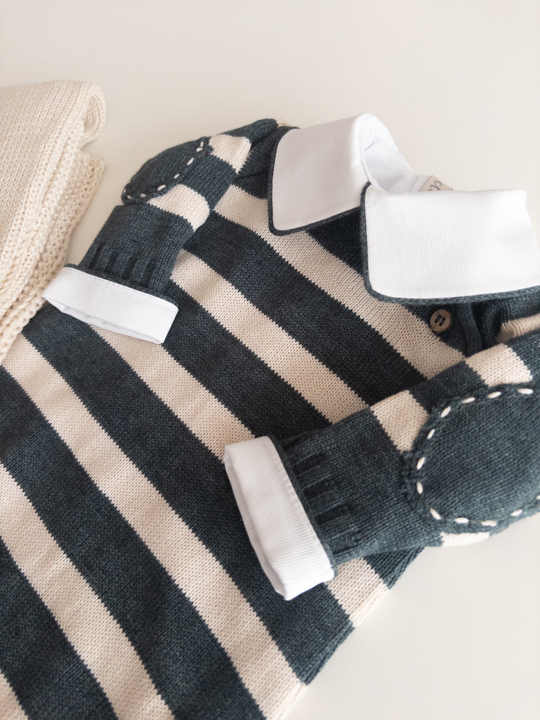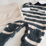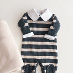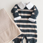 The Raziel romper features a beautiful striped embroidery, adding a charming touch. Made from soft yarns, it has front buttonholes for easy dressing. Perfect for keeping your little one cozy and stylish—whether for special occasions or everyday moments.