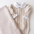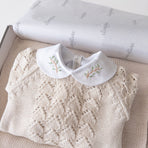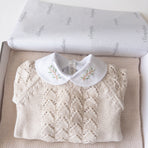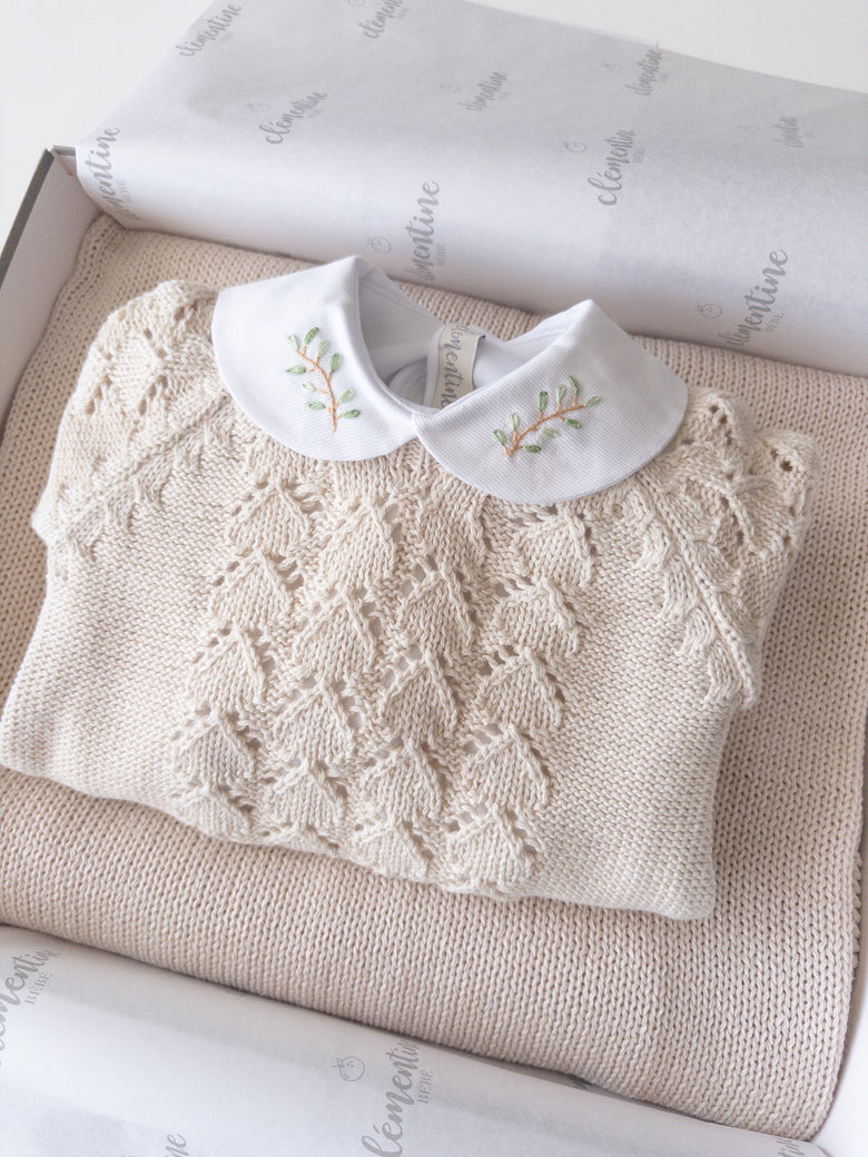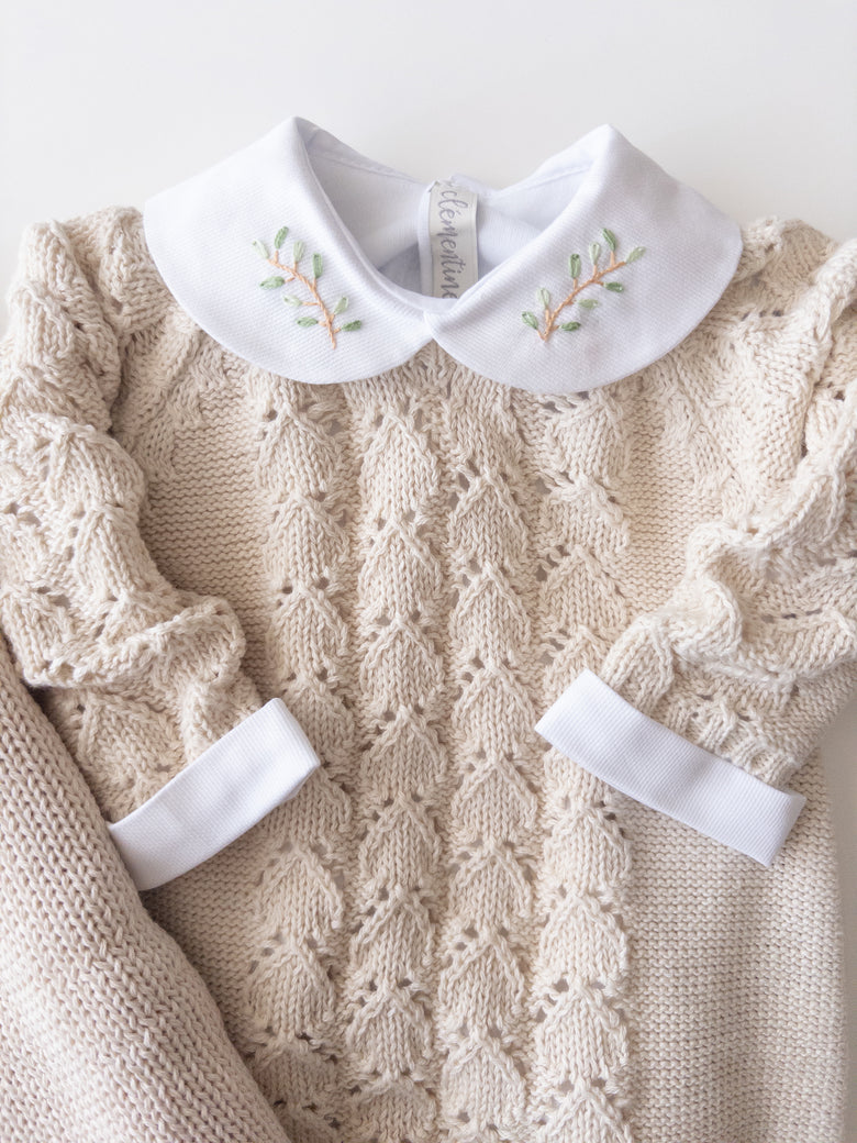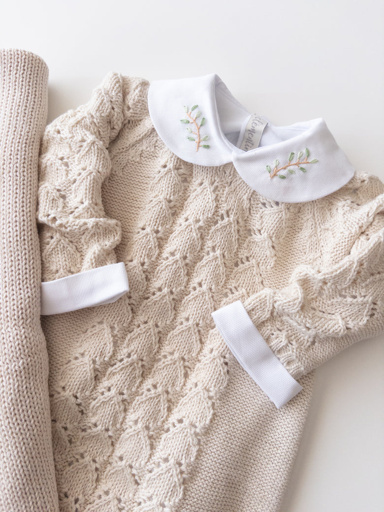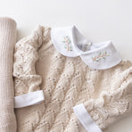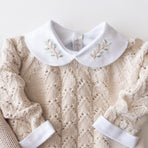 It comes with a lovely cotton bodysuit, adorned with delicate hand-embroidered branches. Made from soft, breathable fabric, this bodysuit provides all-day comfort for sensitive skin. The embroidered collar adds a touch of elegance and charm, ideal for special occasions or everyday wear.