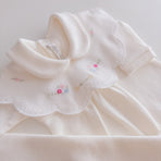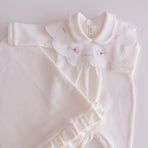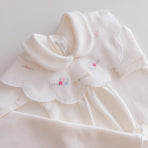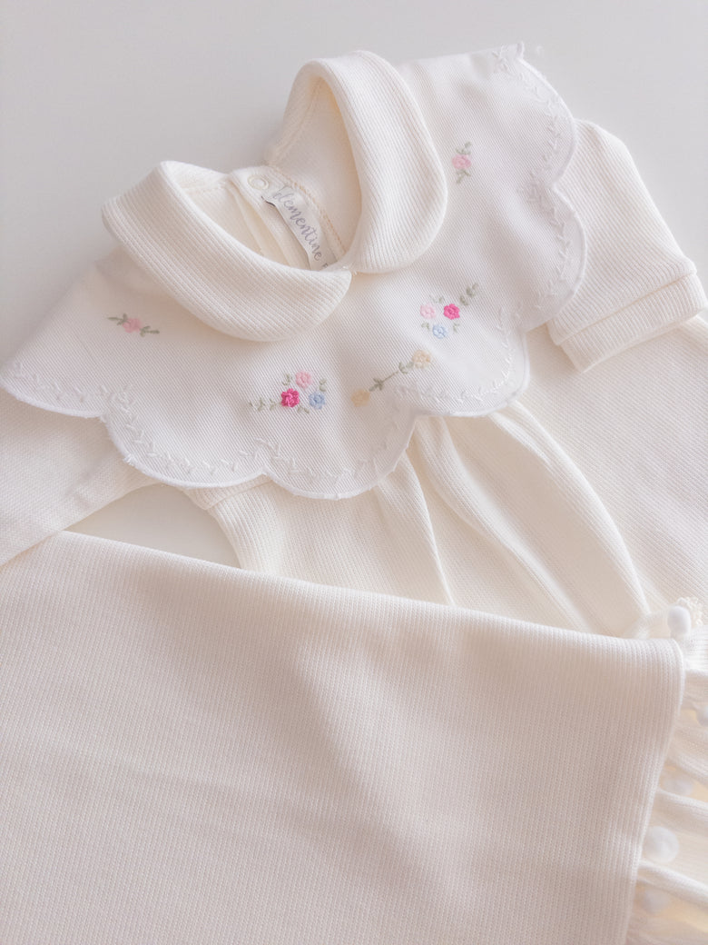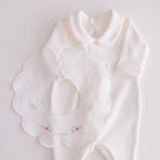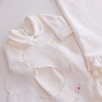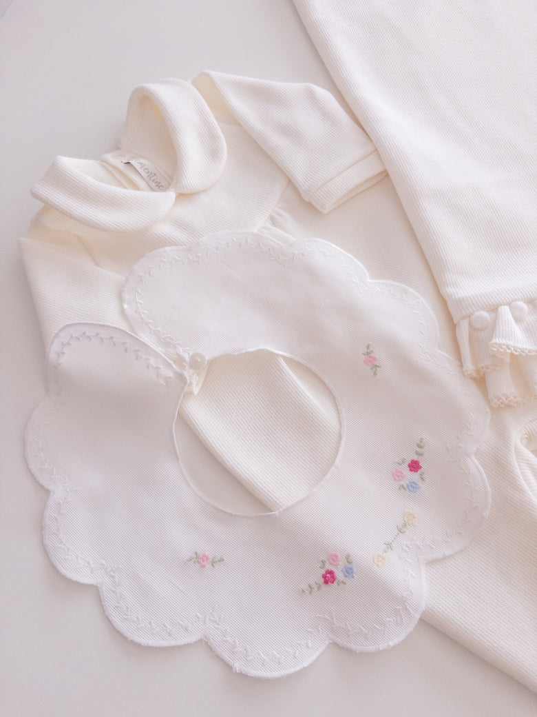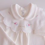 Charm everyone with the elegance and delicacy of our 100% cotton newborn take-home outfit. Decorated with floral embroidery that evokes purity and tenderness, every detail has been carefully chosen. The romper can be worn with or without the little bib collar for added versatility.