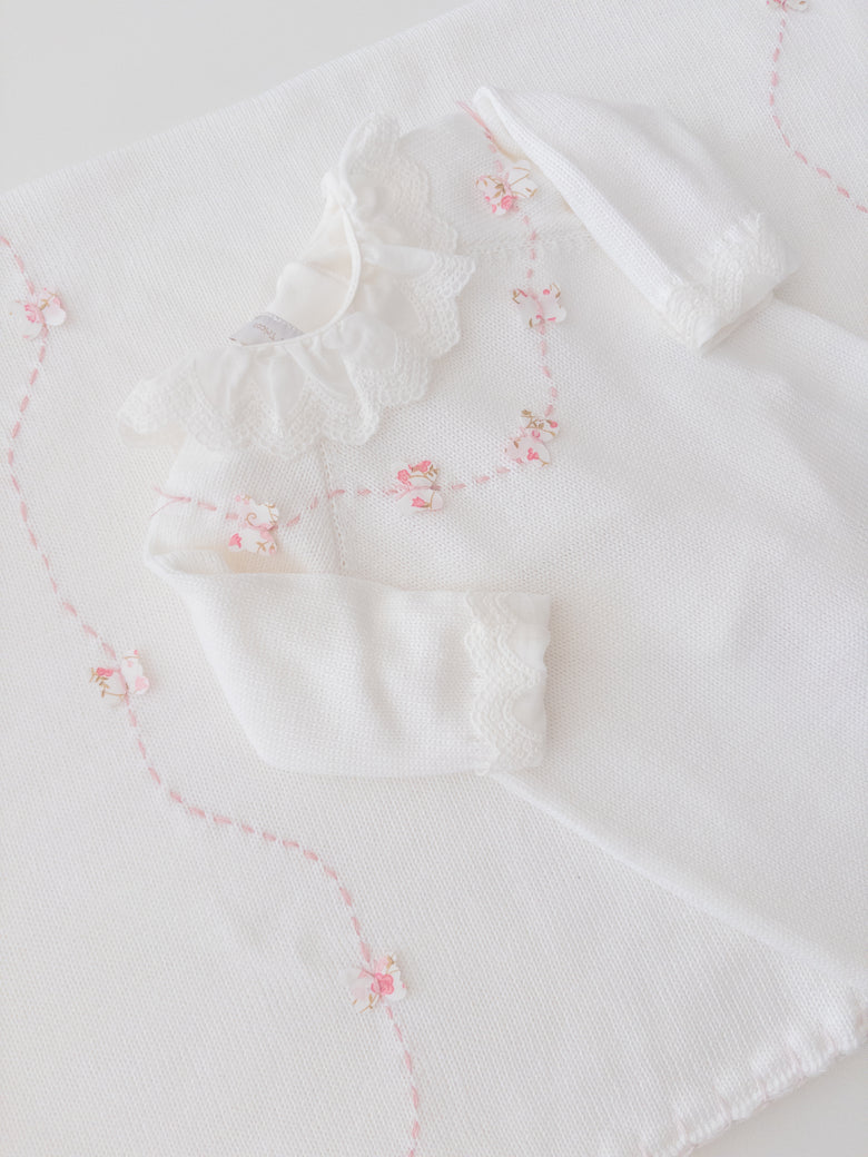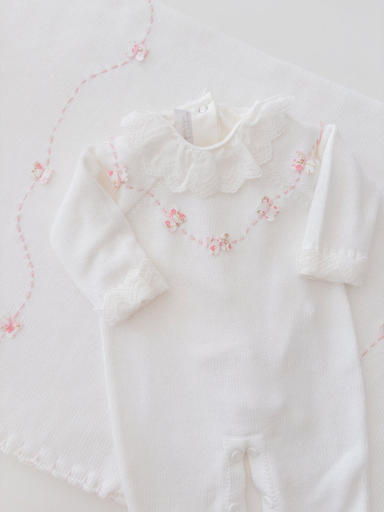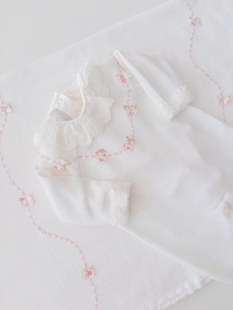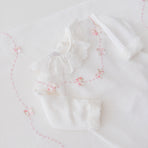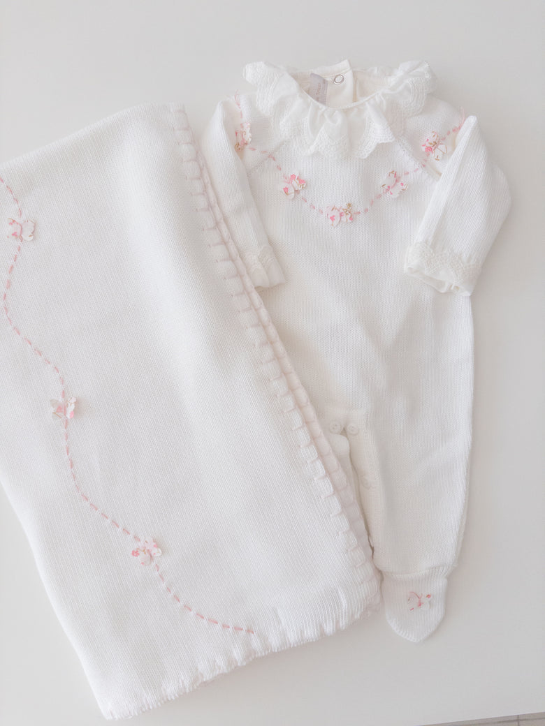 This charming set includes a soft knitted outfit featuring delicate embroidered butterflies, adding a gentle and beautiful touch to your baby's first look. It comes with a 100% cotton bodysuit for added comfort.