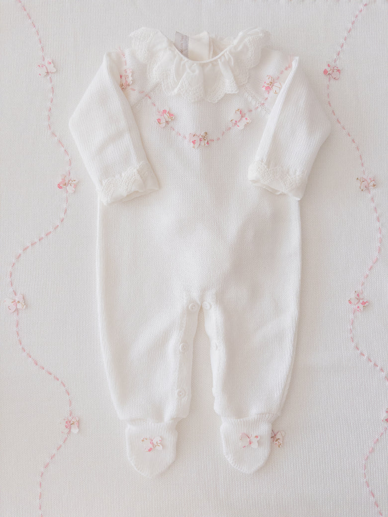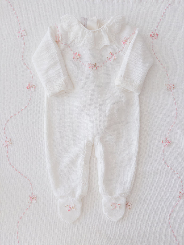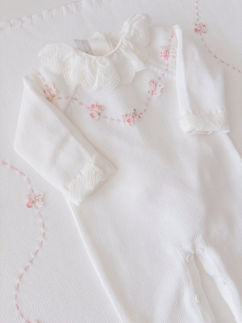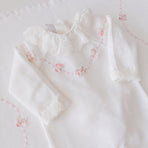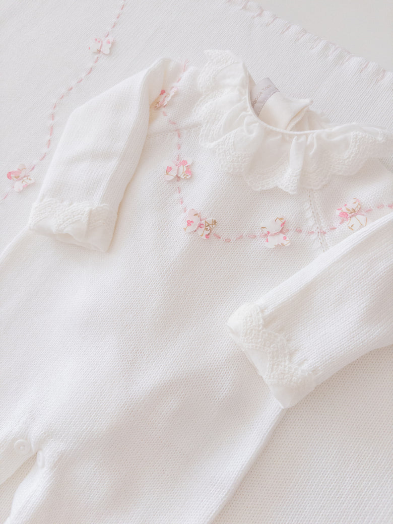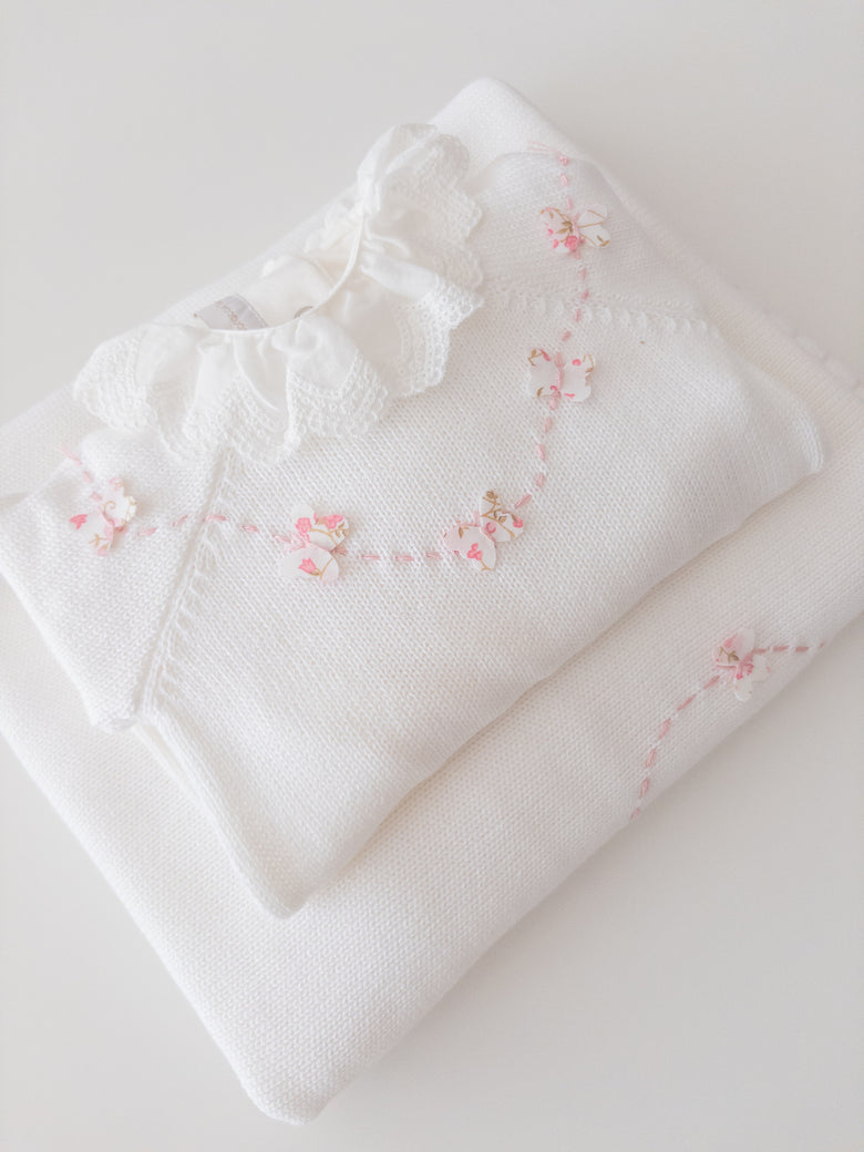 This charming set includes a soft knitted outfit featuring delicate embroidered butterflies, adding a gentle and beautiful touch to your baby's first look. It comes with a 100% cotton bodysuit for added comfort.