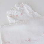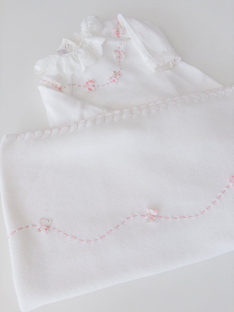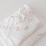 The embroidered butterfly blanket completes the set, offering a cozy and warm feel. The detailed embroidery along the edges of the blanket adds sweetness and softness to the ensemble.
