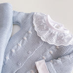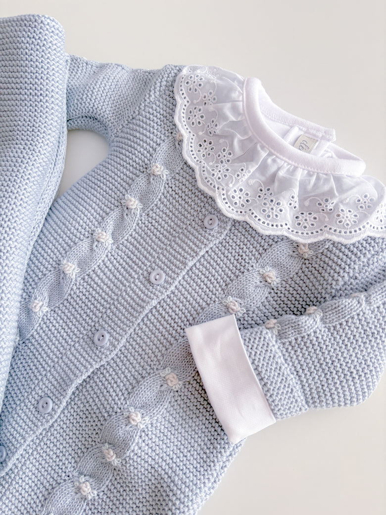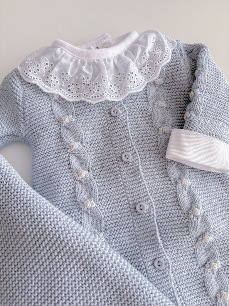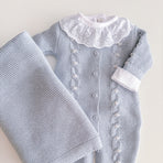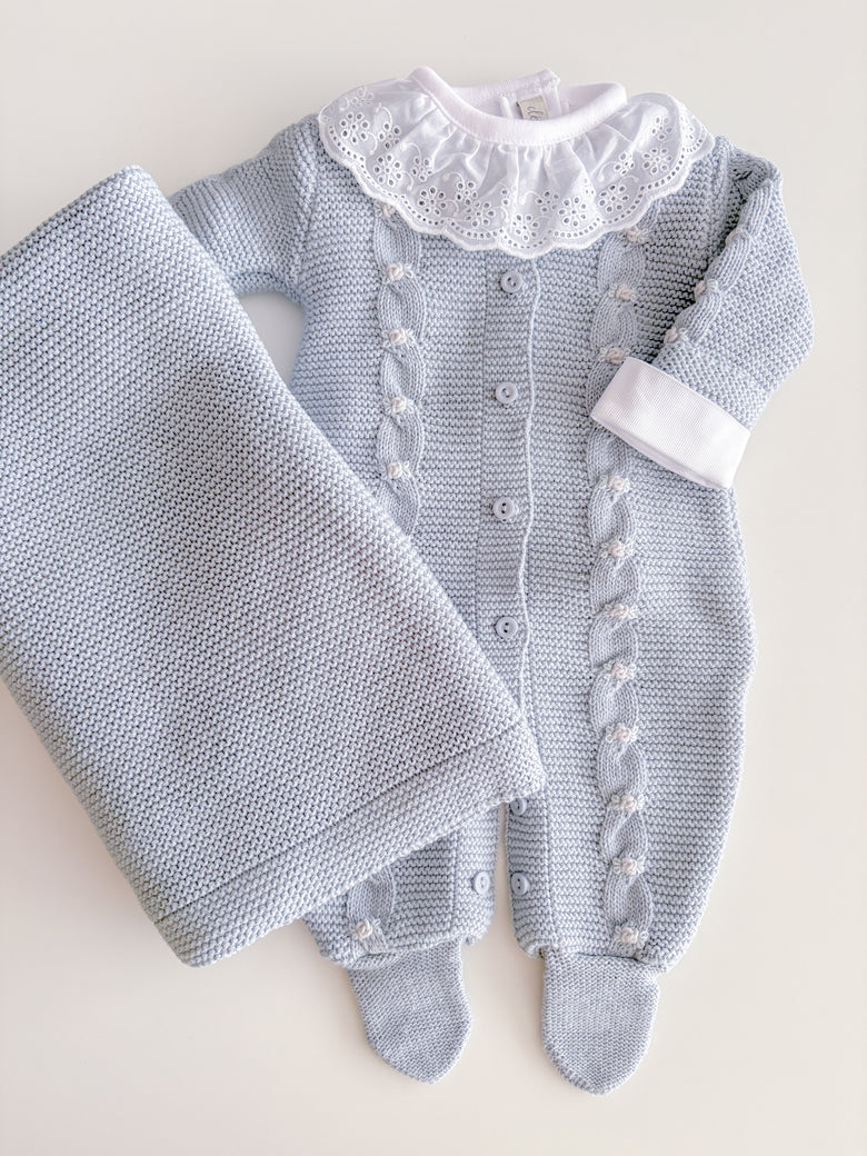 Accompanied by a matching blanket and a floral bodysuit, together they form a set that celebrates the beauty of childhood with style and sophistication. Each piece is an invitation to comfort and elegance, transforming every moment into a charming experience.