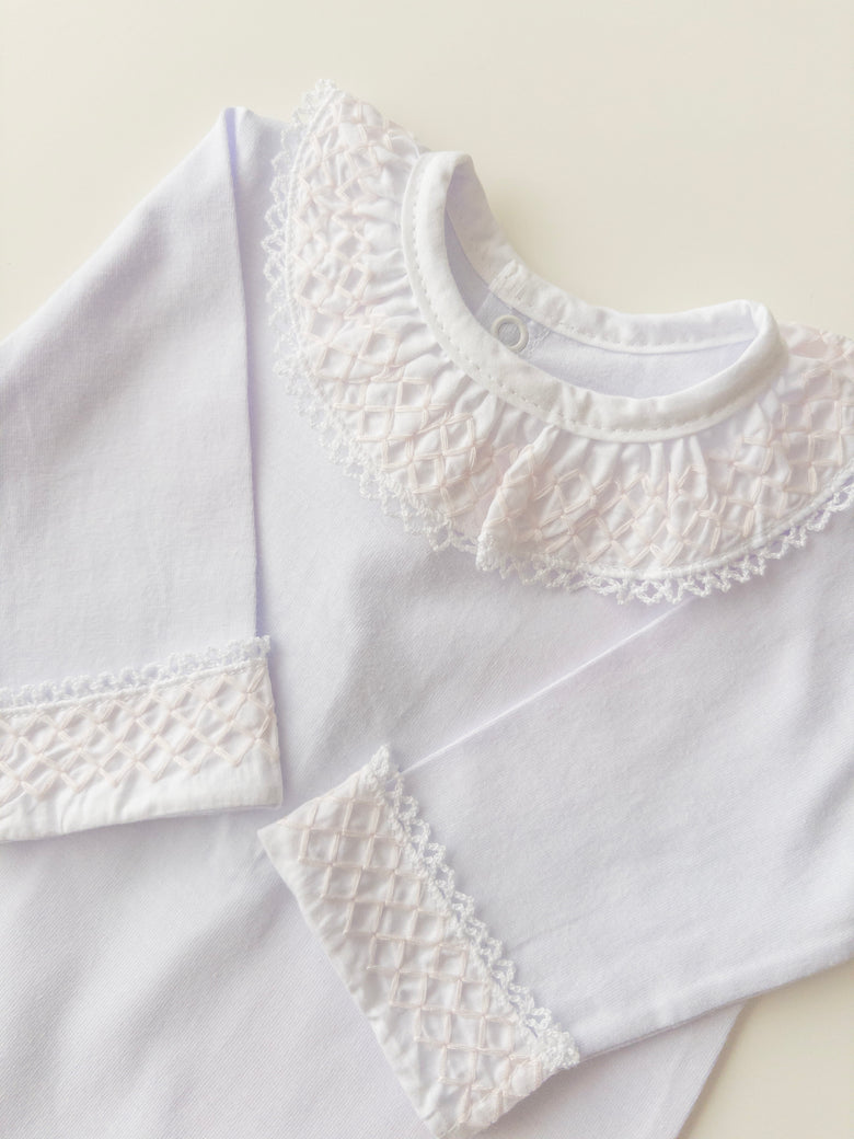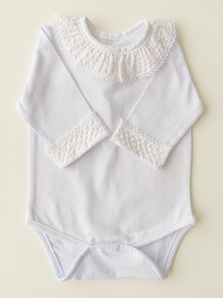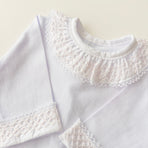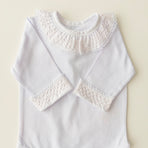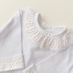 This bodysuit is made from soft, breathable fabric to keep your baby comfortable all day long. The embroidered collar adds a touch of sophistication and sweetness, bringing charm and a timeless, elegant look. Perfect for any occasion, this bodysuit is a symbol of comfort and style. A lovely addition to your little one’s wardrobe.