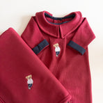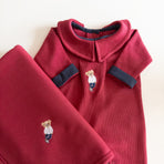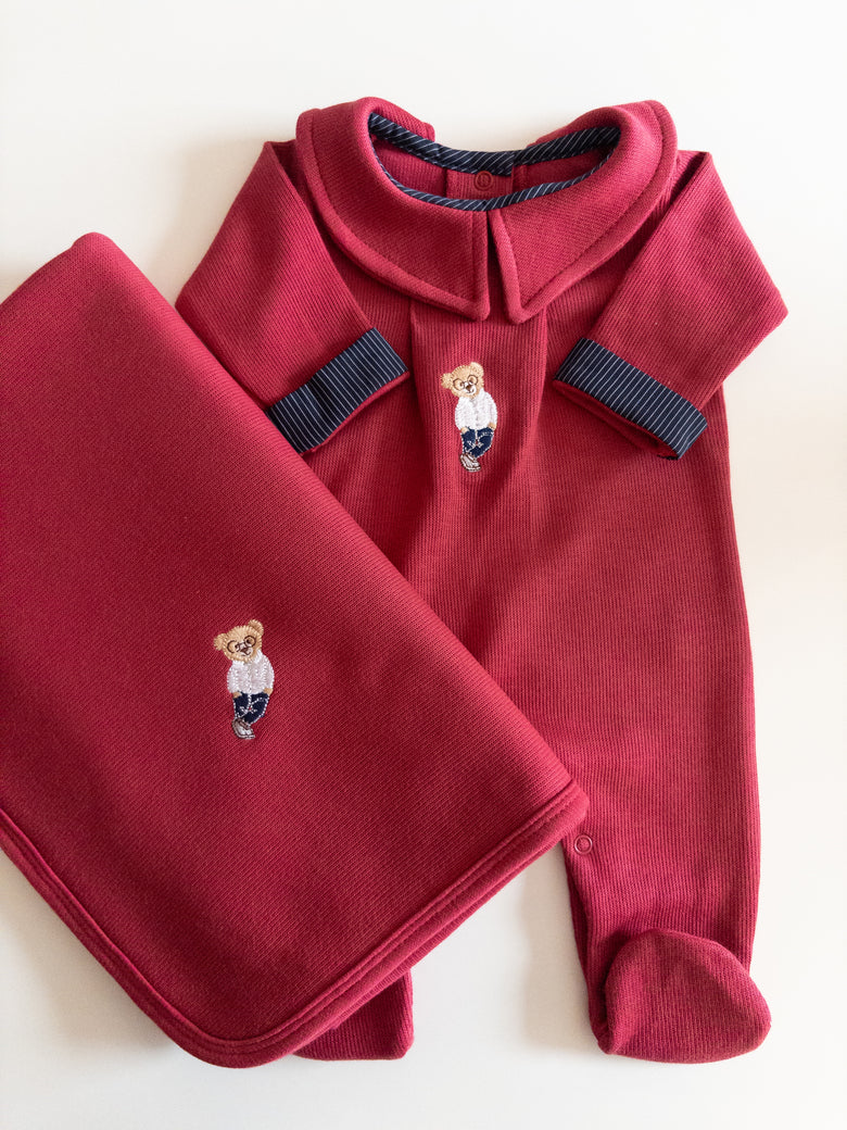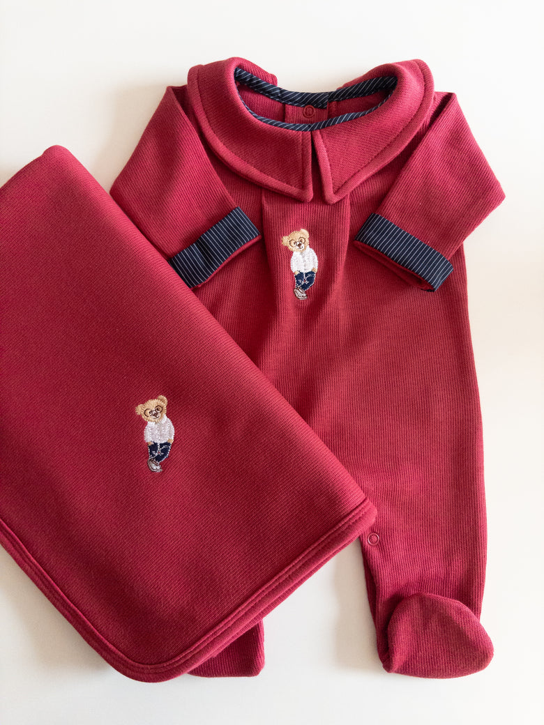 This charming set includes a jumpsuit and a blanket, both delicately embroidered with an adorable little bear. The jumpsuit offers practicality with style, while the blanket gently wraps your baby in warmth and comfort — making it ideal for those precious first days together.