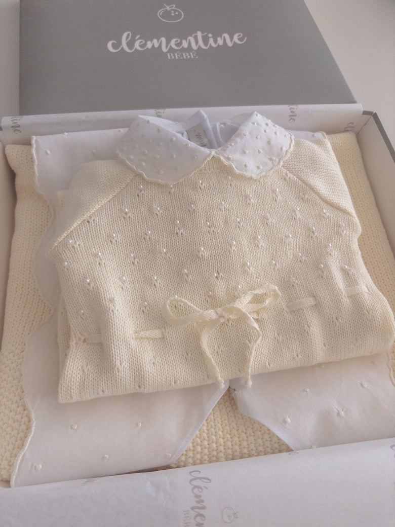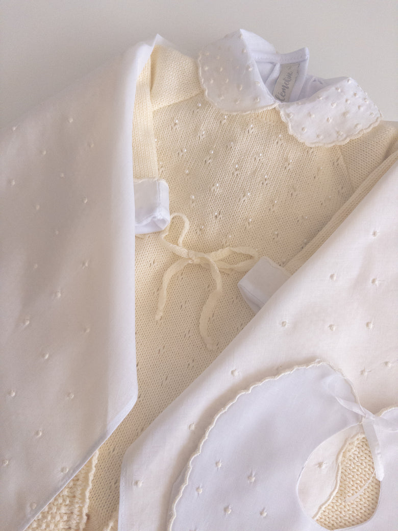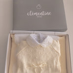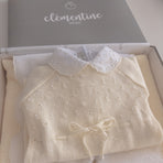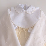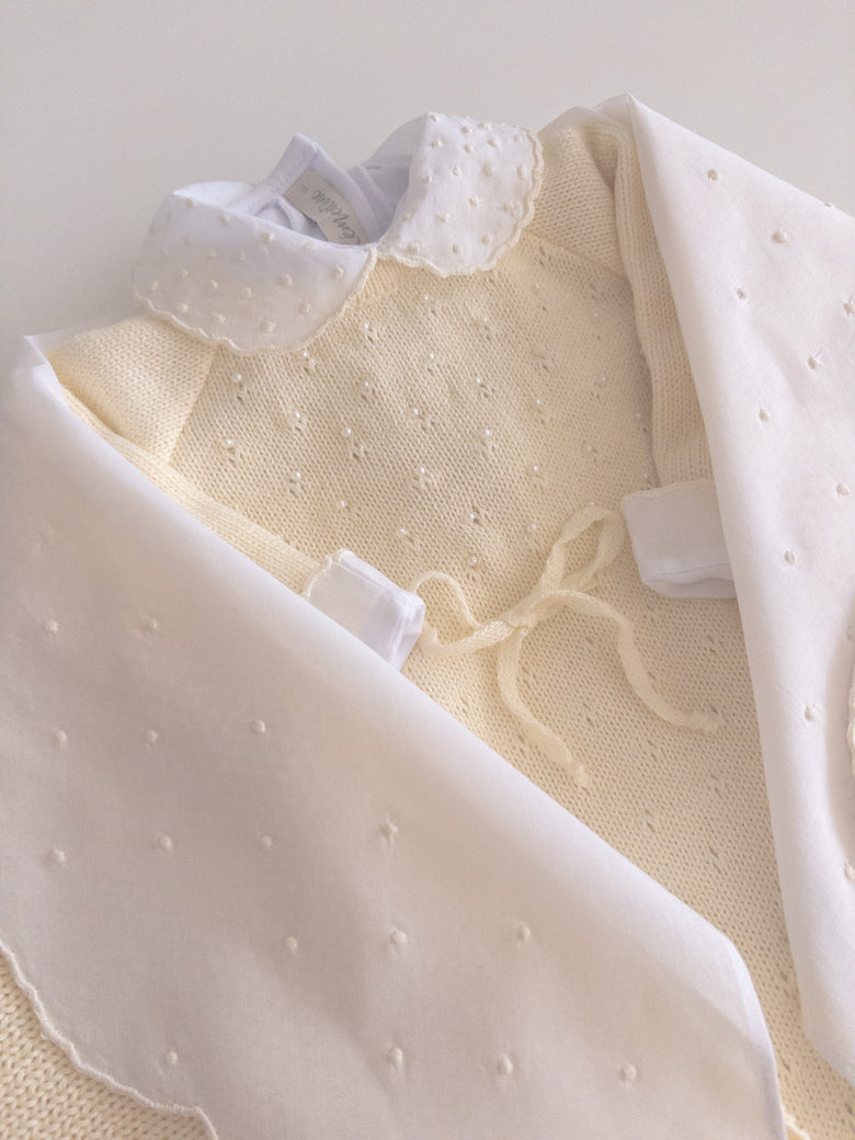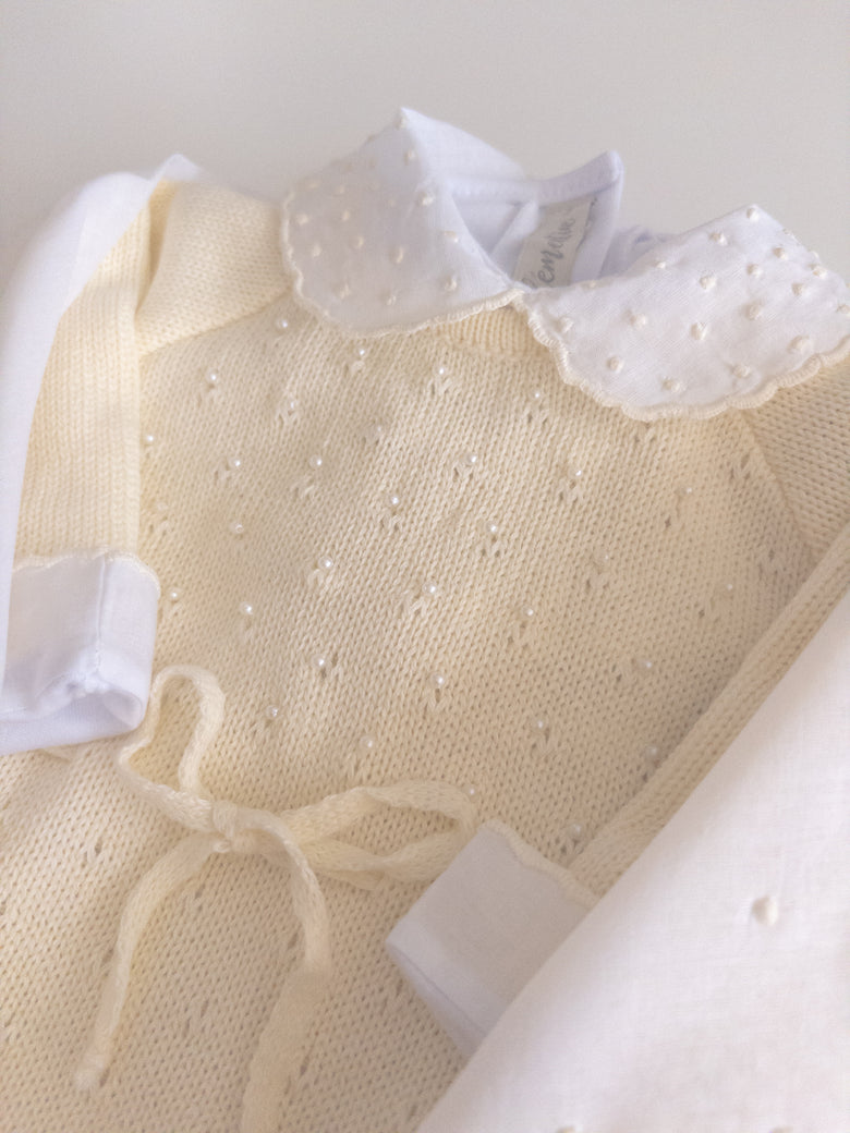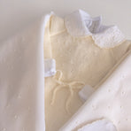The jumpsuit is delicately adorned with pearls, adding a touch of elegance and sophistication to your baby’s look. Made from soft, breathable fabrics, it ensures maximum comfort for newborns. The set includes a beautiful cotton bodysuit, featuring a smocked collar that adds sweetness and refinement, standing out with its intricate honeycomb-like pattern. This classic detail brings both charm and timeless elegance to the ensemble.