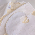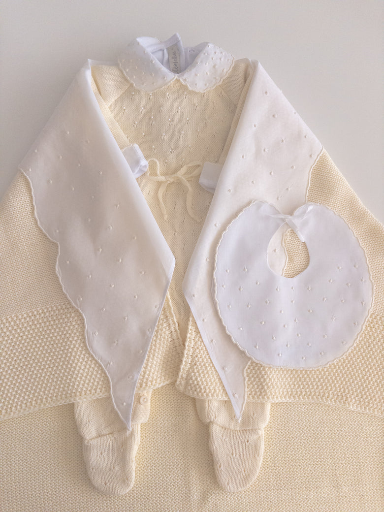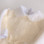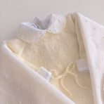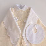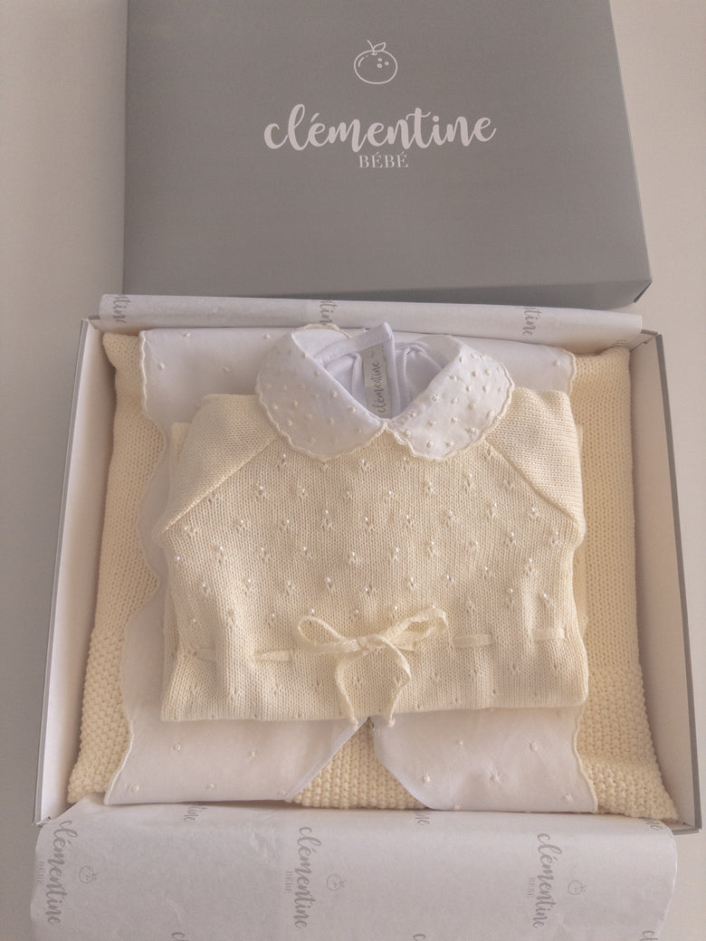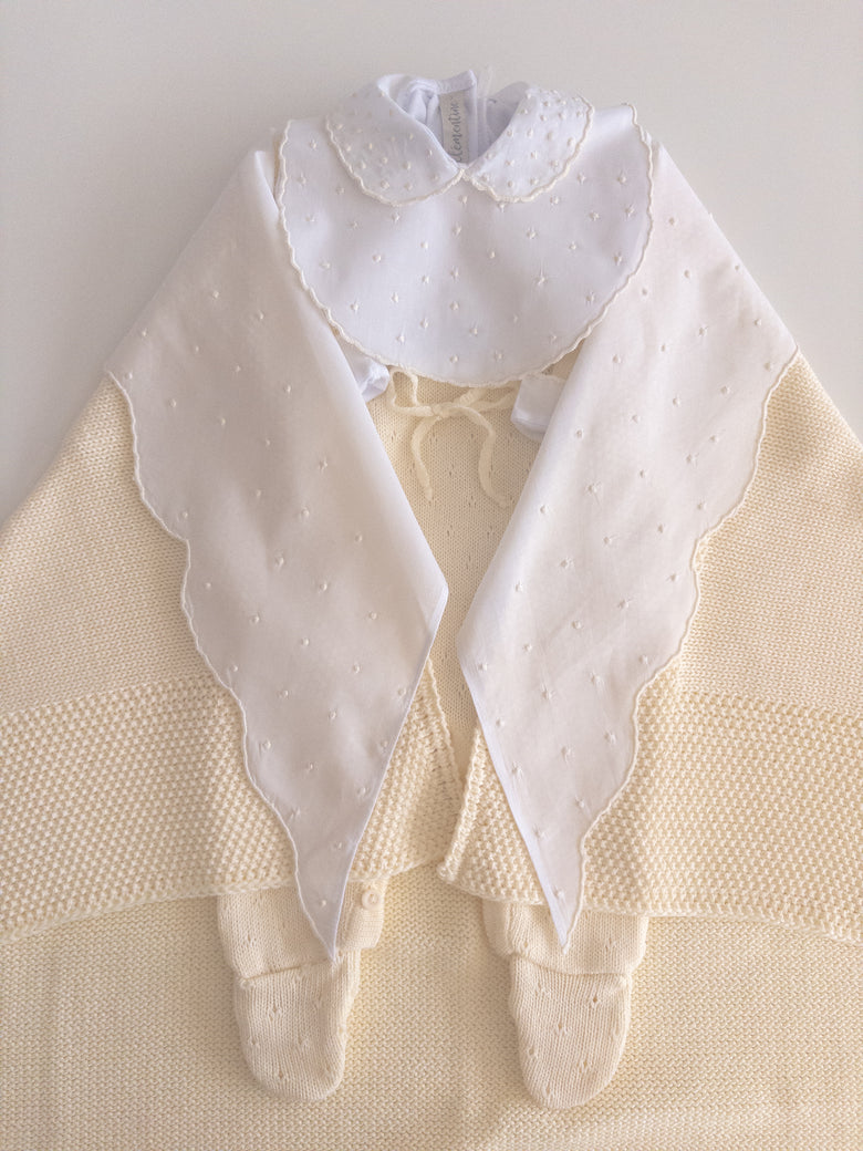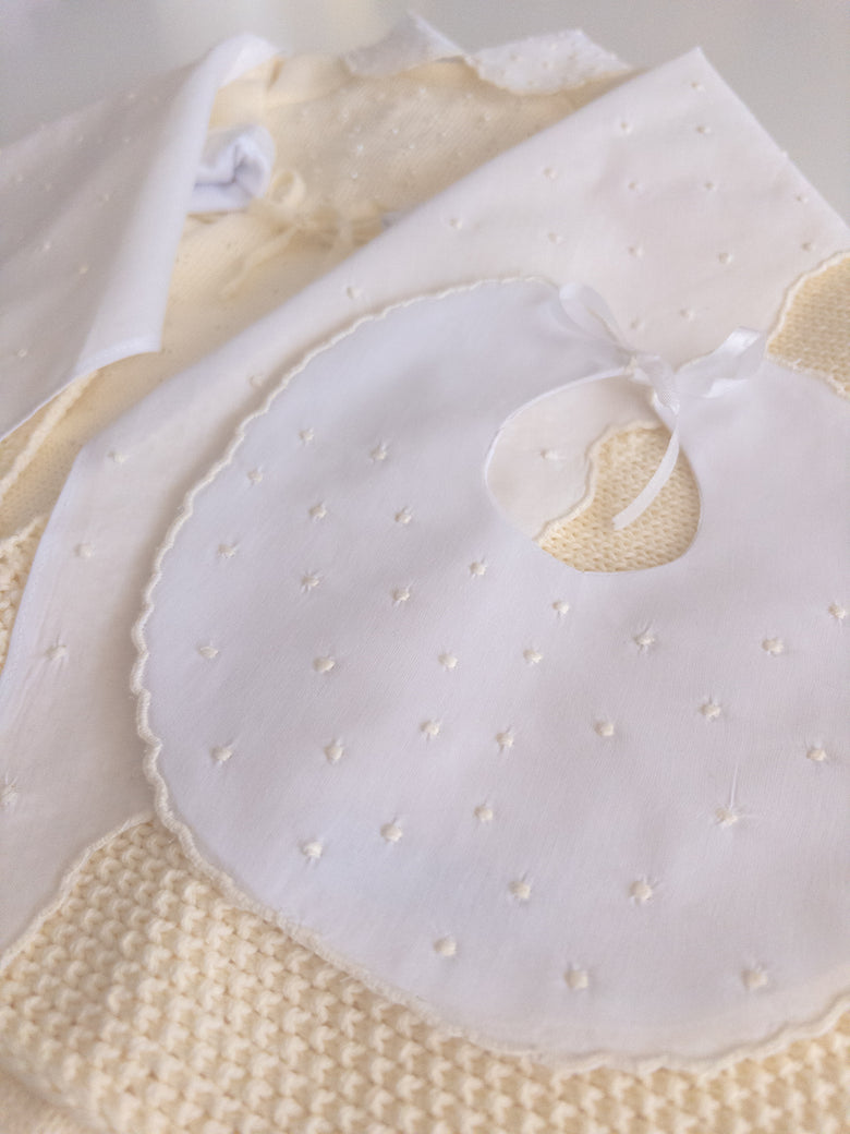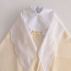 The jumpsuit is delicately adorned with pearls, adding a touch of elegance and sophistication to your baby’s look. Made from soft, breathable fabrics, it ensures maximum comfort for newborns. The set includes a beautiful cotton bodysuit, featuring a smocked collar that adds sweetness and refinement, standing out with its intricate honeycomb-like pattern. This classic detail brings both charm and timeless elegance to the ensemble.