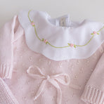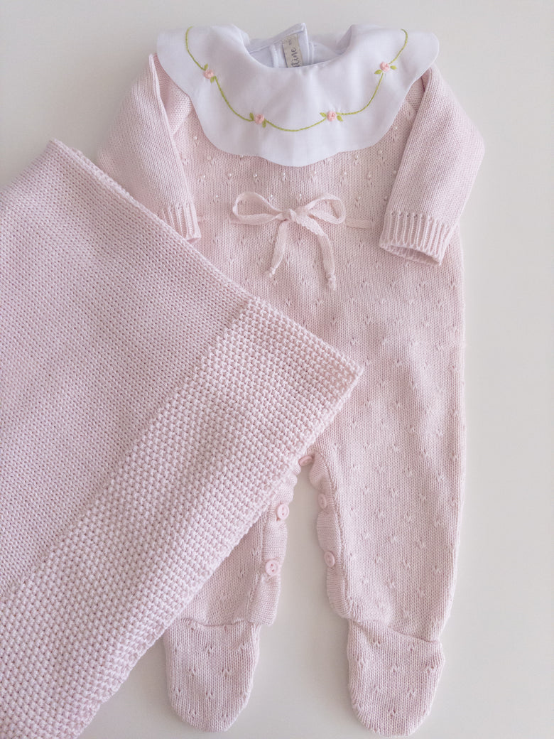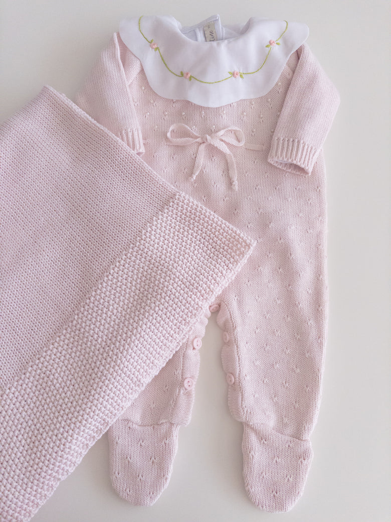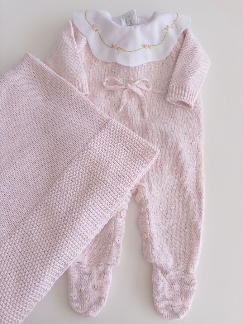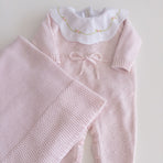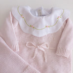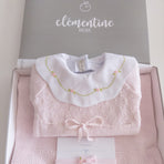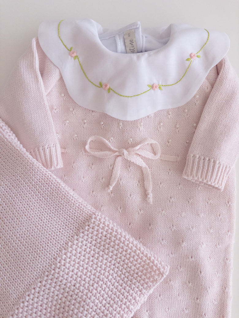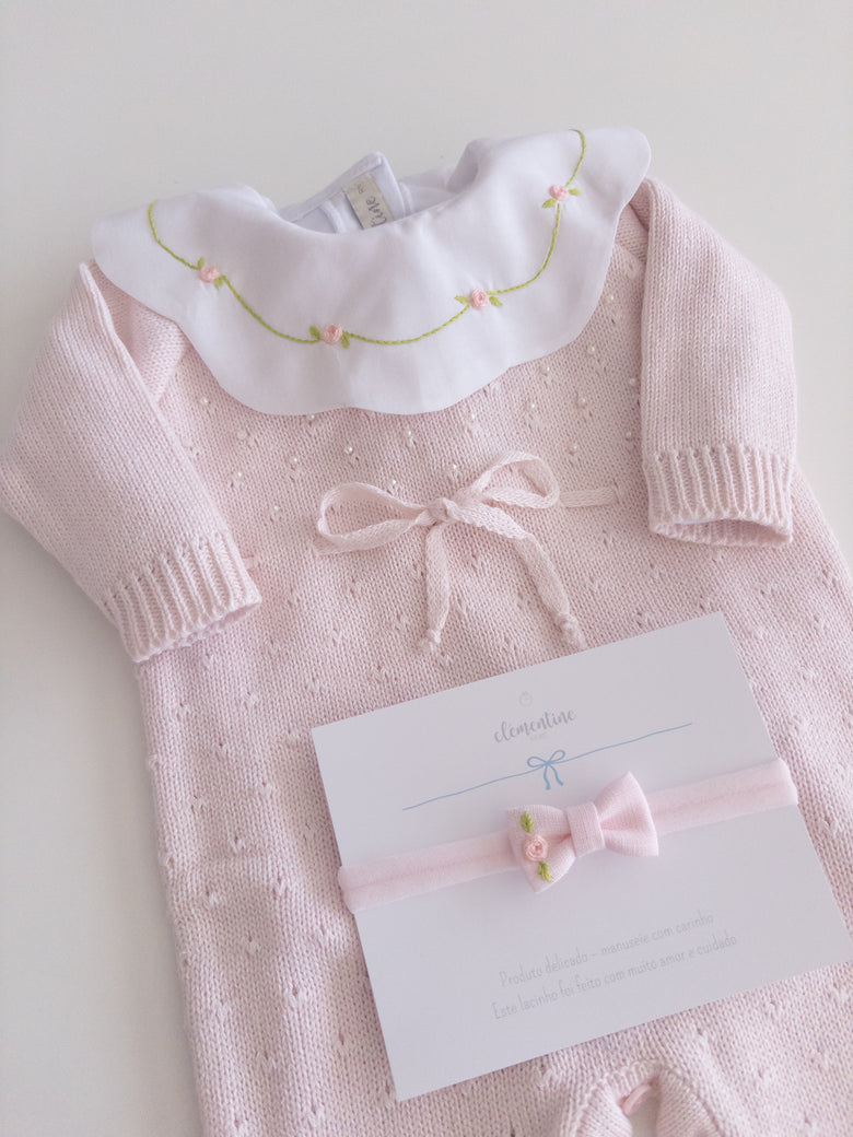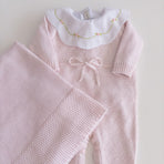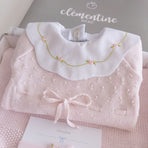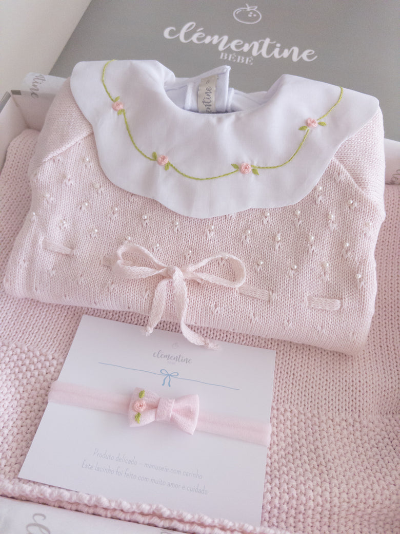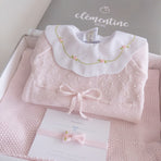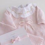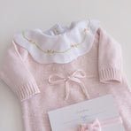 A charming Dijon maternity outfit. A jumpsuit delicately adorned with pearls, adding a touch of elegance and sophistication to your baby’s look. Made with soft and breathable fabrics, providing maximum comfort for the newborn. Accompanied by a beautiful cotton bodysuit, featuring a honeycomb collar that adds a touch of sophistication and sweetness, standing out with its intricate pattern reminiscent of honeycombs. Besides adding charm, the collar also provides a classic and elegant appearance.