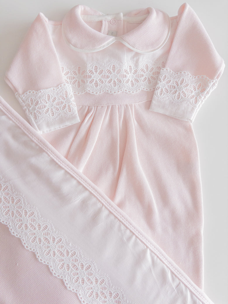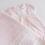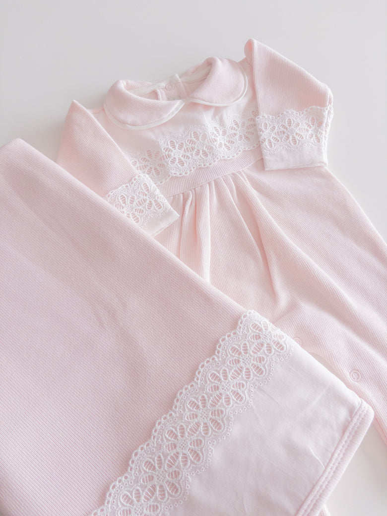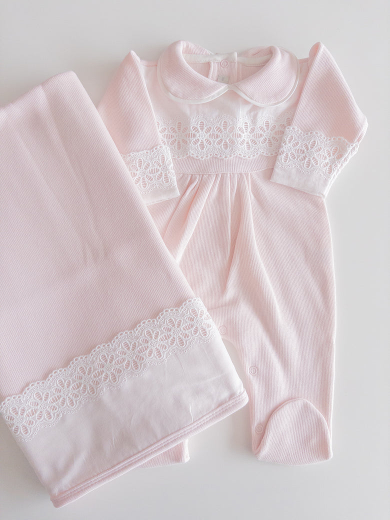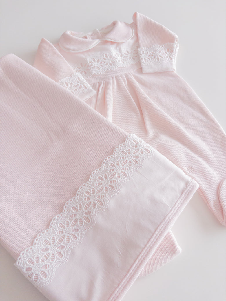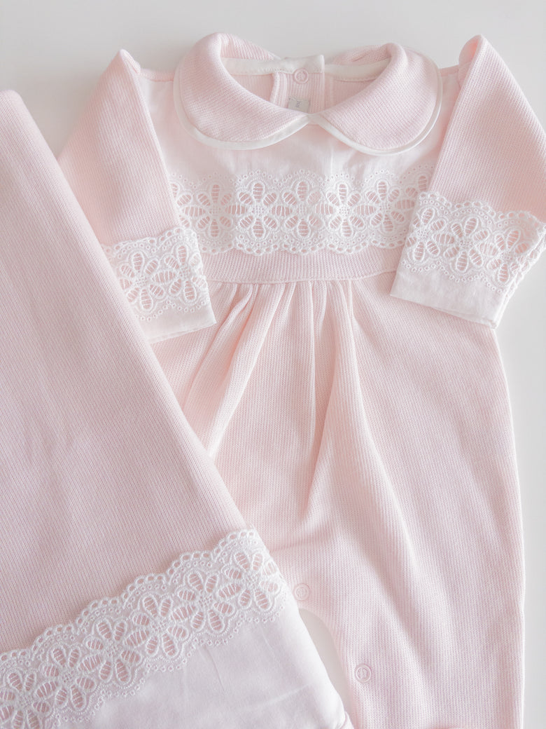 Flora Newborn Coming Home Set, adorned with delicate details that capture the essence of purity and love. The elegant touch of lace enhances the design, creating a charming and cozy ensemble. Accompanied by a matching lace-trimmed blanket, it offers comfort and style from the very first moment. Perfect for creating precious memories and special moments that will be cherished forever. Romantic and delicate.