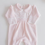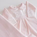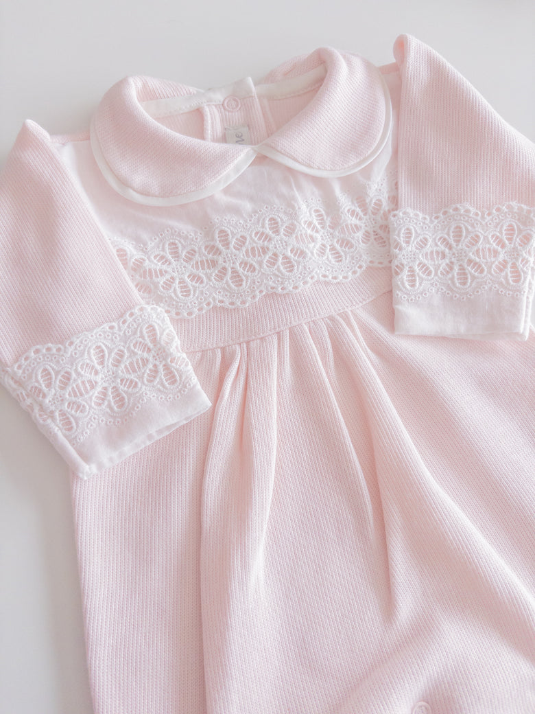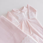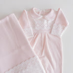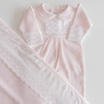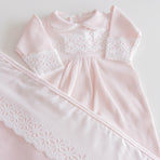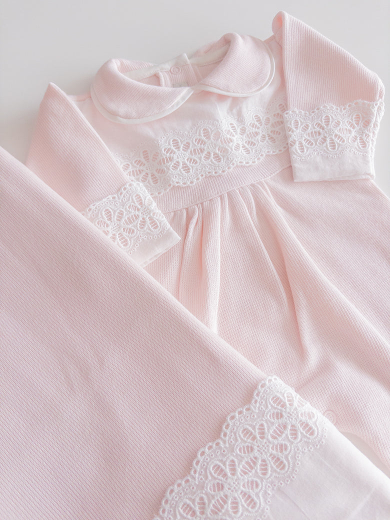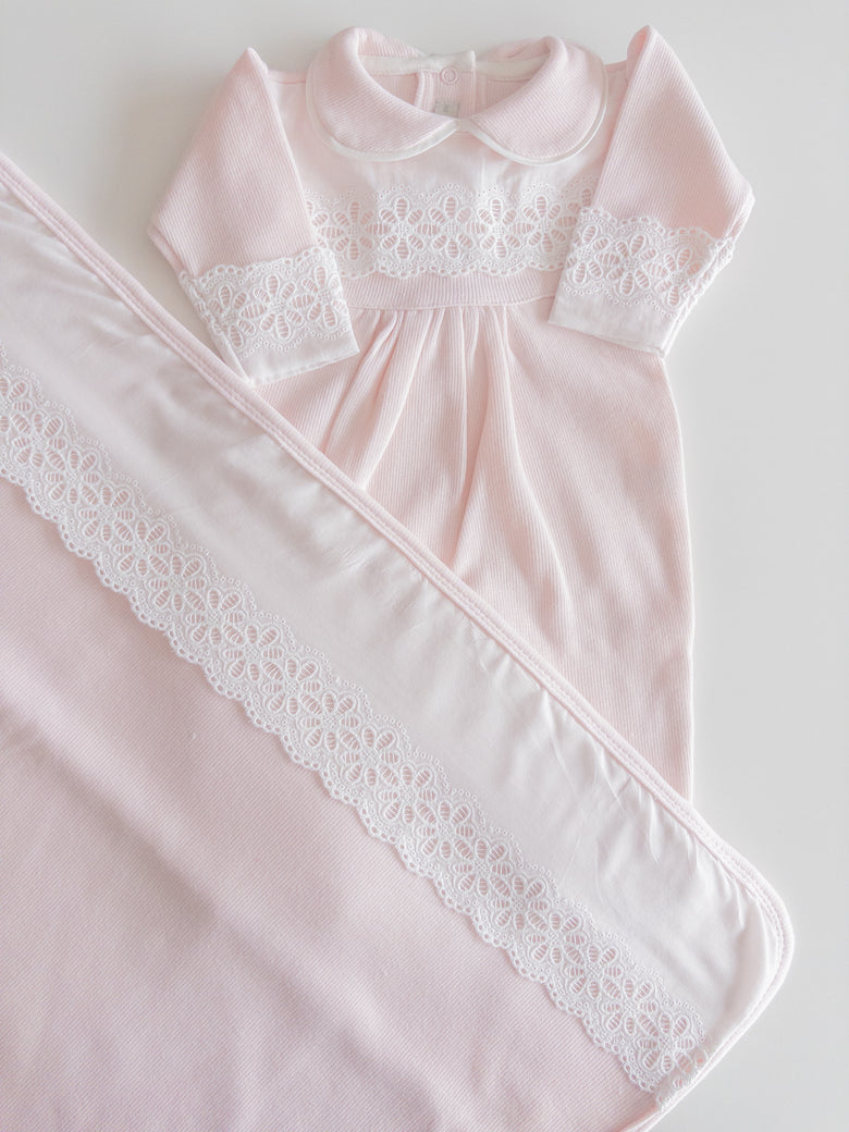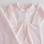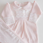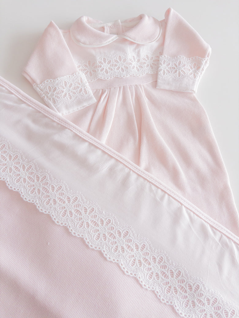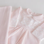 Flora Newborn Coming Home Set, adorned with delicate details that capture the essence of purity and love. The elegant touch of lace enhances the design, creating a charming and cozy ensemble. Accompanied by a matching lace-trimmed blanket, it offers comfort and style from the very first moment. Perfect for creating precious memories and special moments that will be cherished forever. Romantic and delicate.