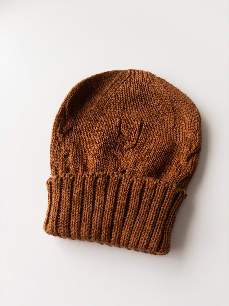 A perfect blend of softness and protection. Made from breathable, gentle knit, it softly hugs the baby’s head, keeping it warm and cozy on cooler days. Its caramel tone adds a touch of tenderness and charm, making it a lovely accessory to complete your little one’s look with care. Ideal for special moments and everyday comfort.