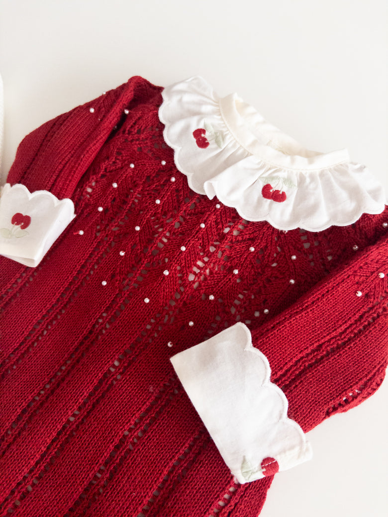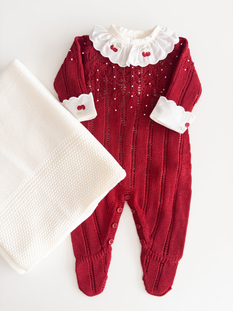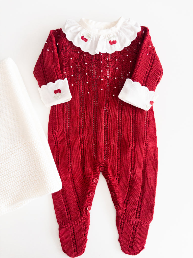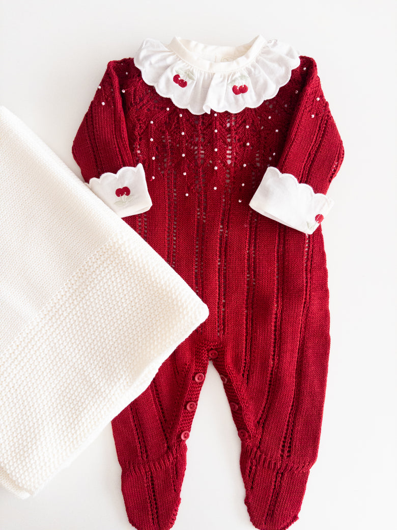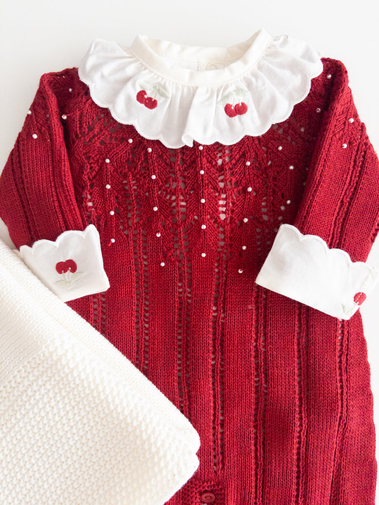 This coming home set features a delicately adorned footed onesie with pearls, adding an elegant and sophisticated touch to your baby girl's look. Made with soft, breathable fabrics, it ensures maximum comfort for the newborn. The set also includes a 100% cotton bodysuit with a cherry-embroidered collar. Perfect for a little princess!