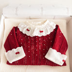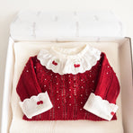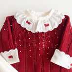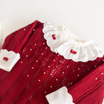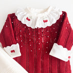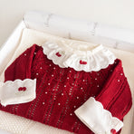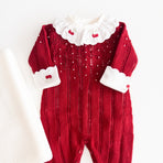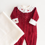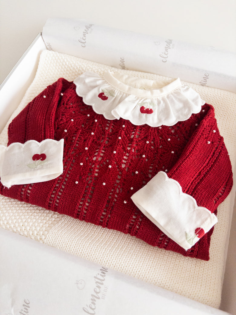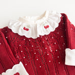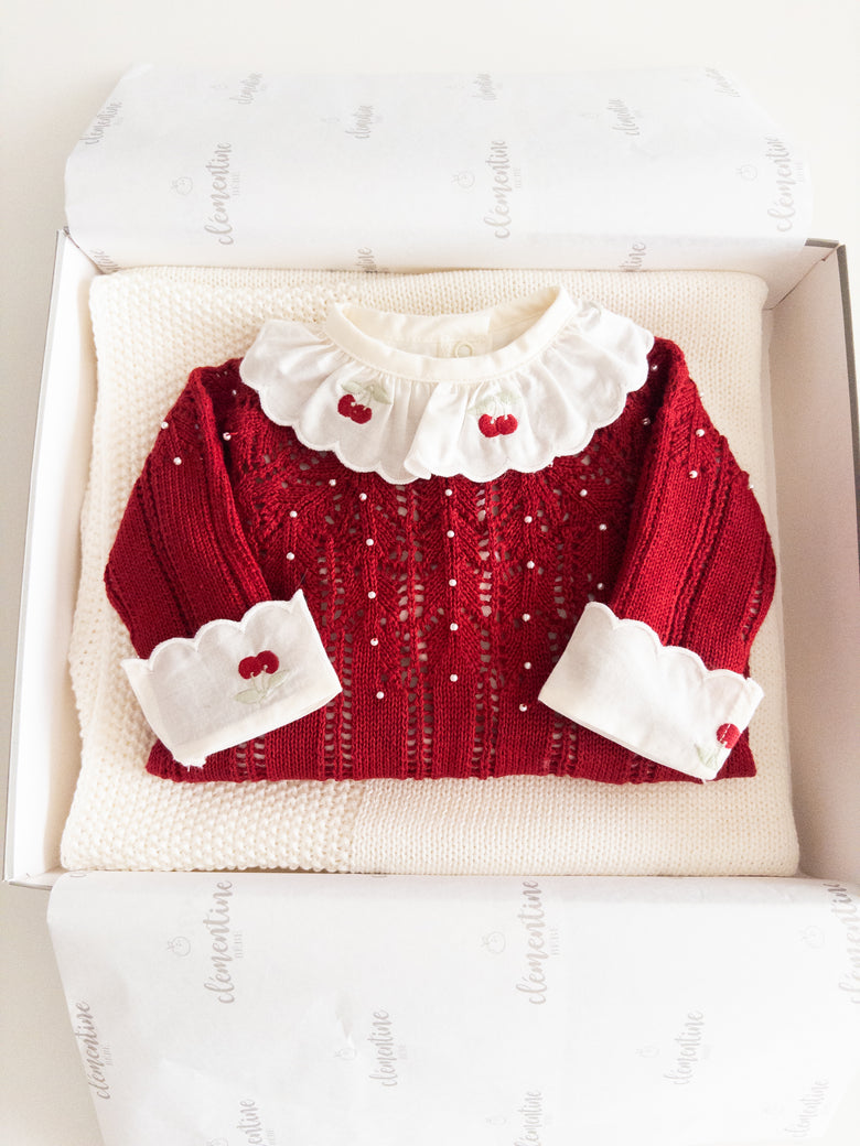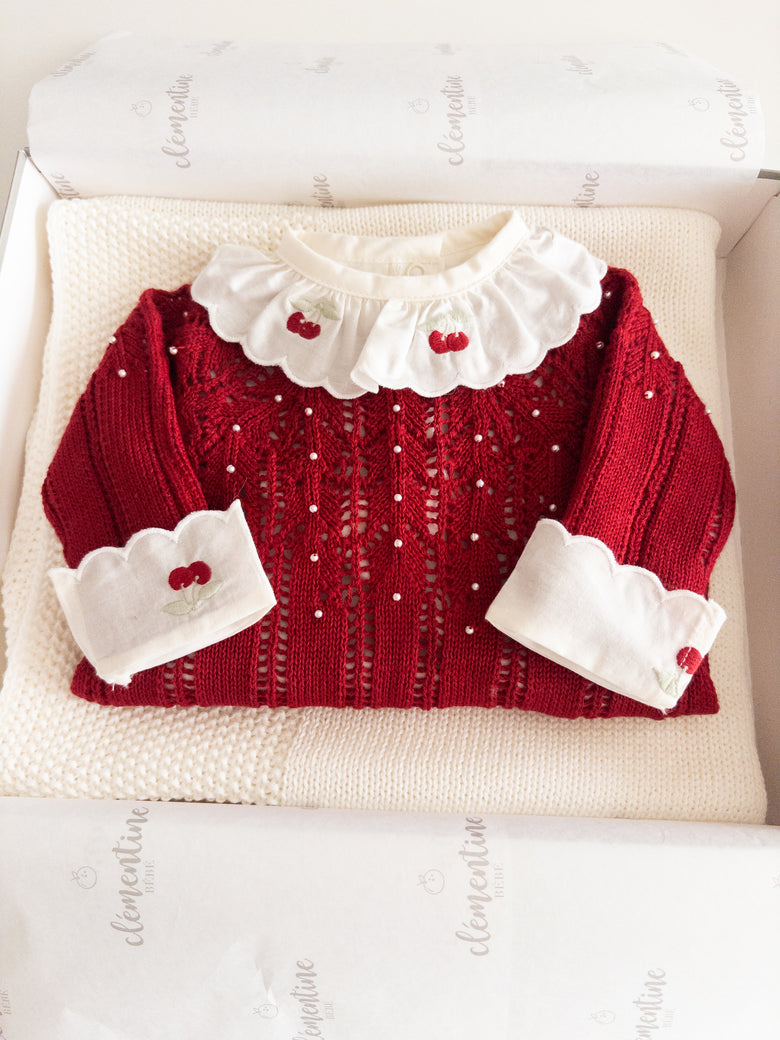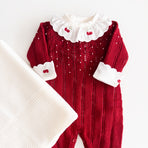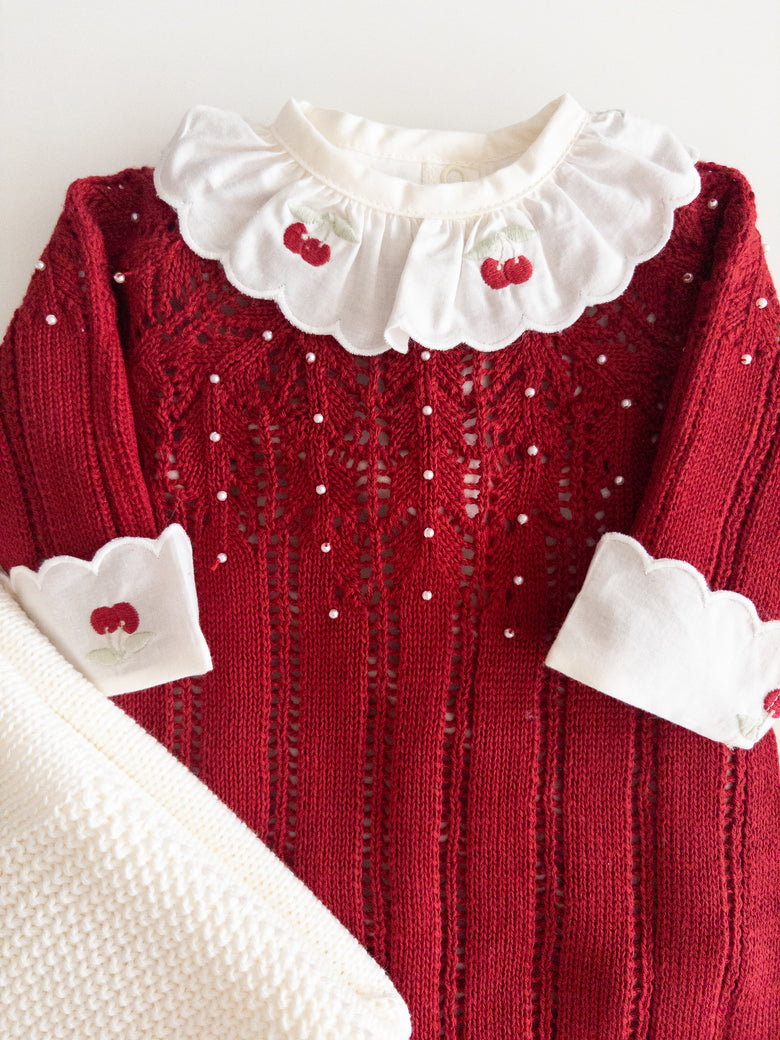 This coming home set features a delicately adorned footed onesie with pearls, adding an elegant and sophisticated touch to your baby girl's look. Made with soft, breathable fabrics, it ensures maximum comfort for the newborn. The set also includes a 100% cotton bodysuit with a cherry-embroidered collar. Perfect for a little princess!