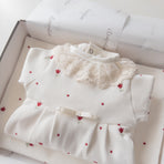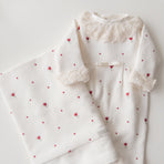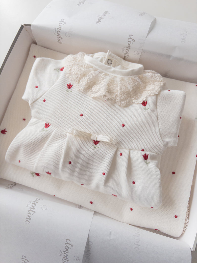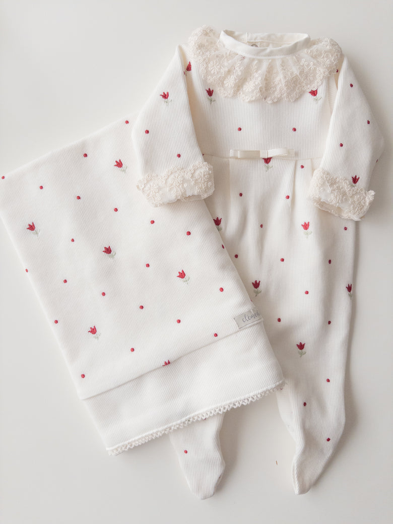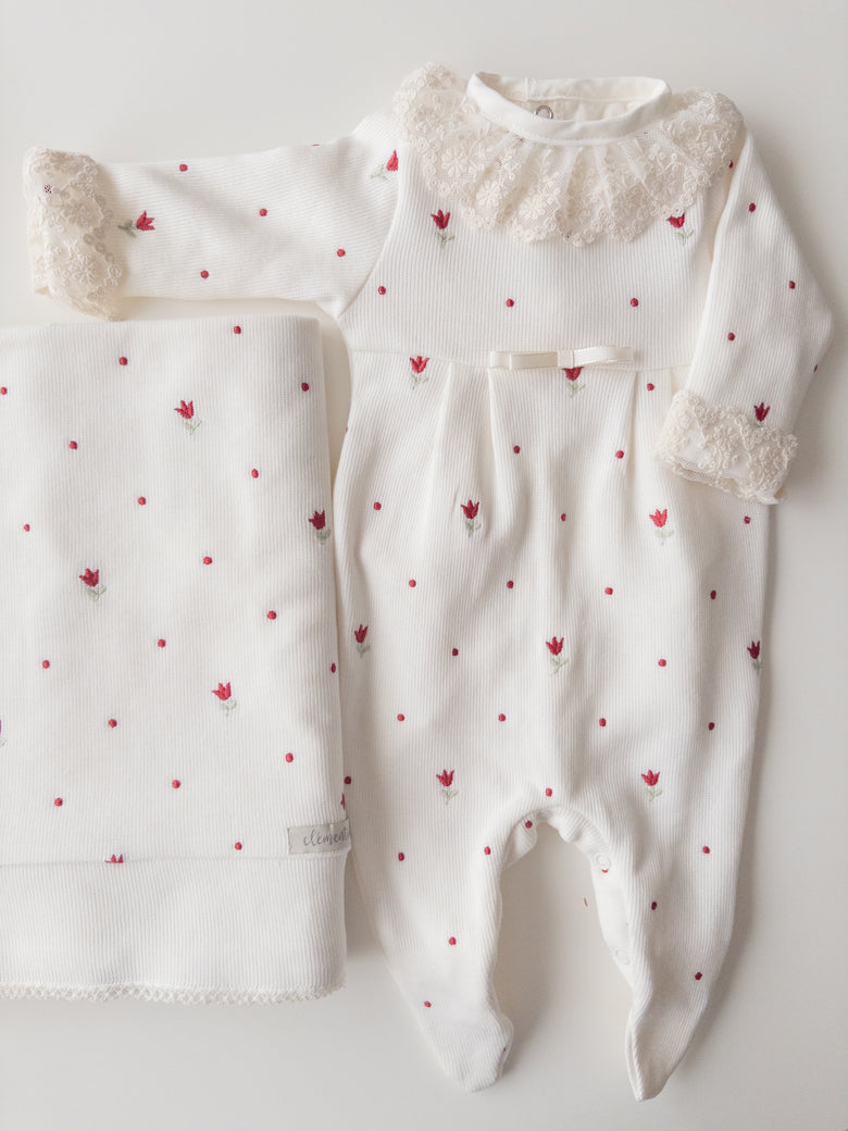 Delight everyone with the elegance and delicacy of our Liz coming home set, made from 100% cotton. The set includes a footie and a blanket, both delicately embroidered with tulips that evoke purity and tenderness. The footie combines practicality with style, while the blanket wraps your baby in softness and warmth—perfect for those first precious moments together. This set not only celebrates your little one's arrival with elegance but also creates cherished memories to keep forever.