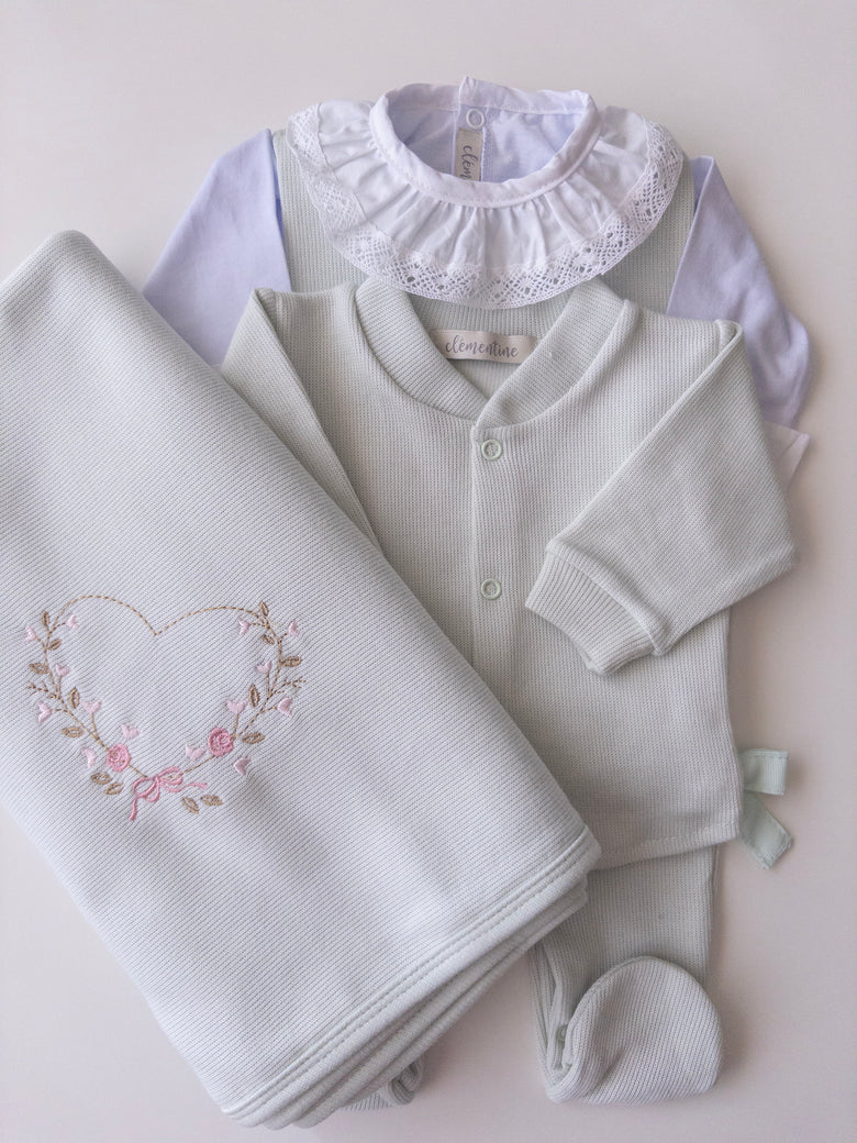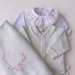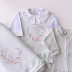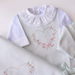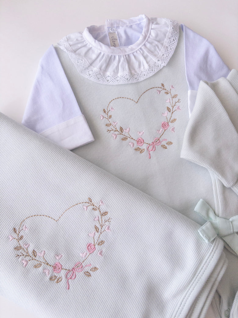 Adorned with heart and flower embroidery that evokes purity and tenderness, every detail has been thoughtfully chosen.