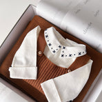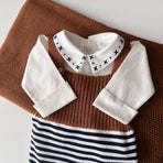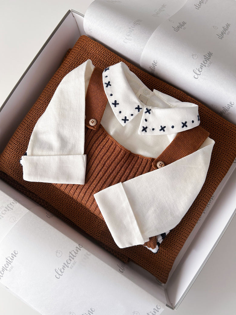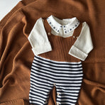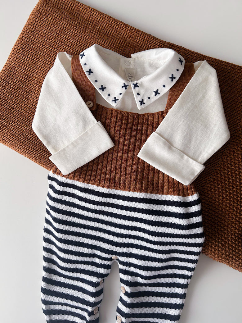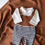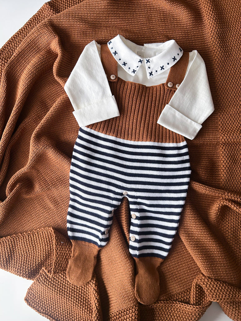 Charming Coming-Home Set, featuring a caramel knit romper with deep blue stripes, perfectly paired with an elegant bodysuit finished with navy trim. A matching caramel knitted b...