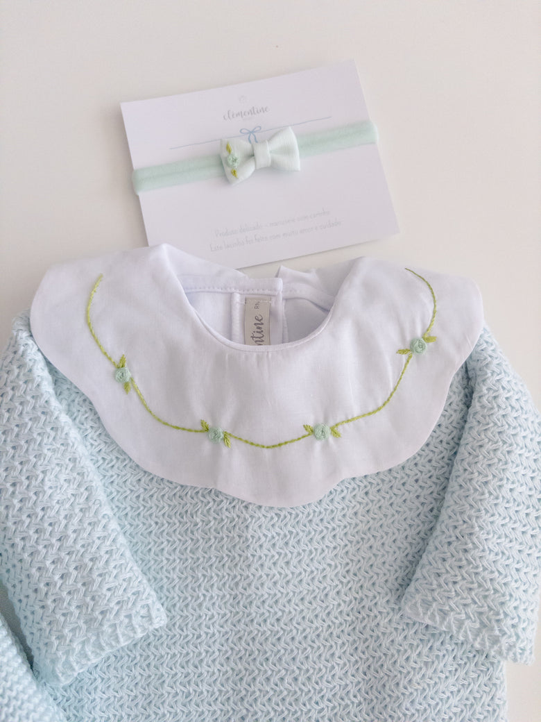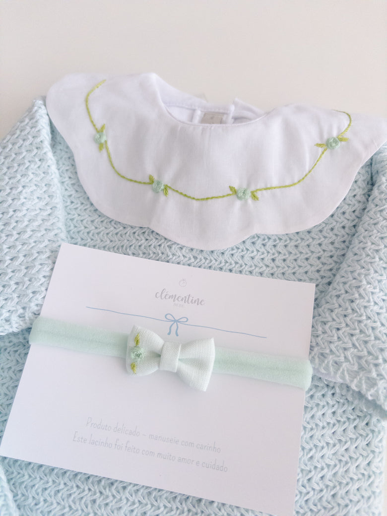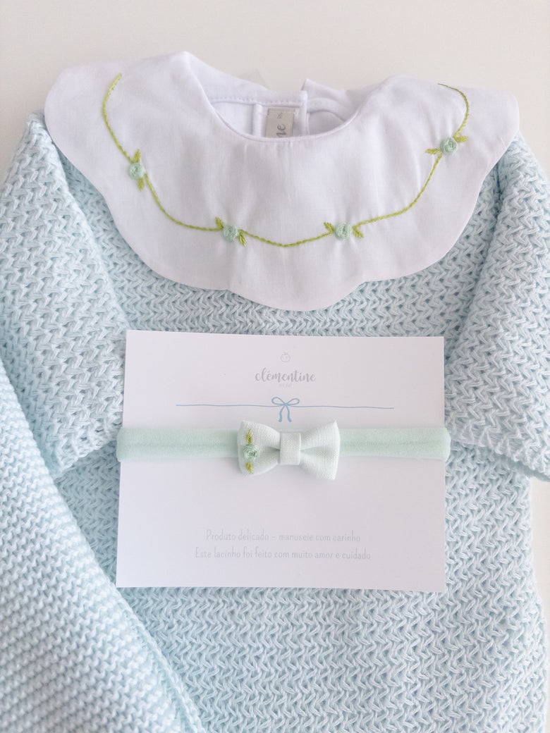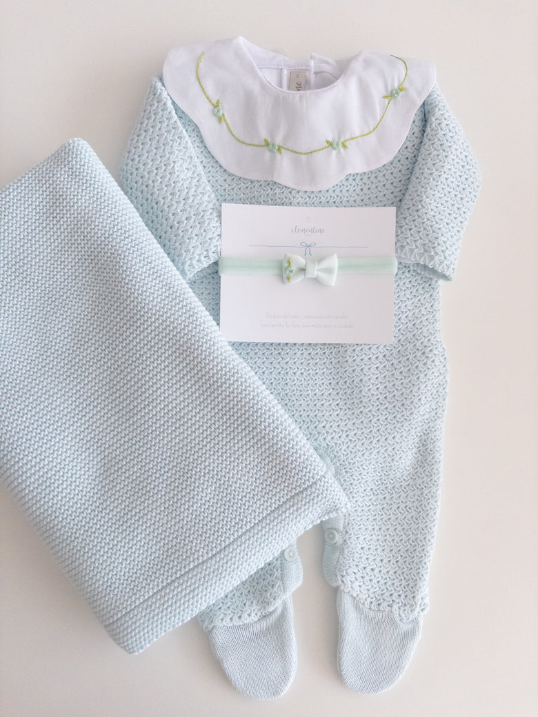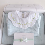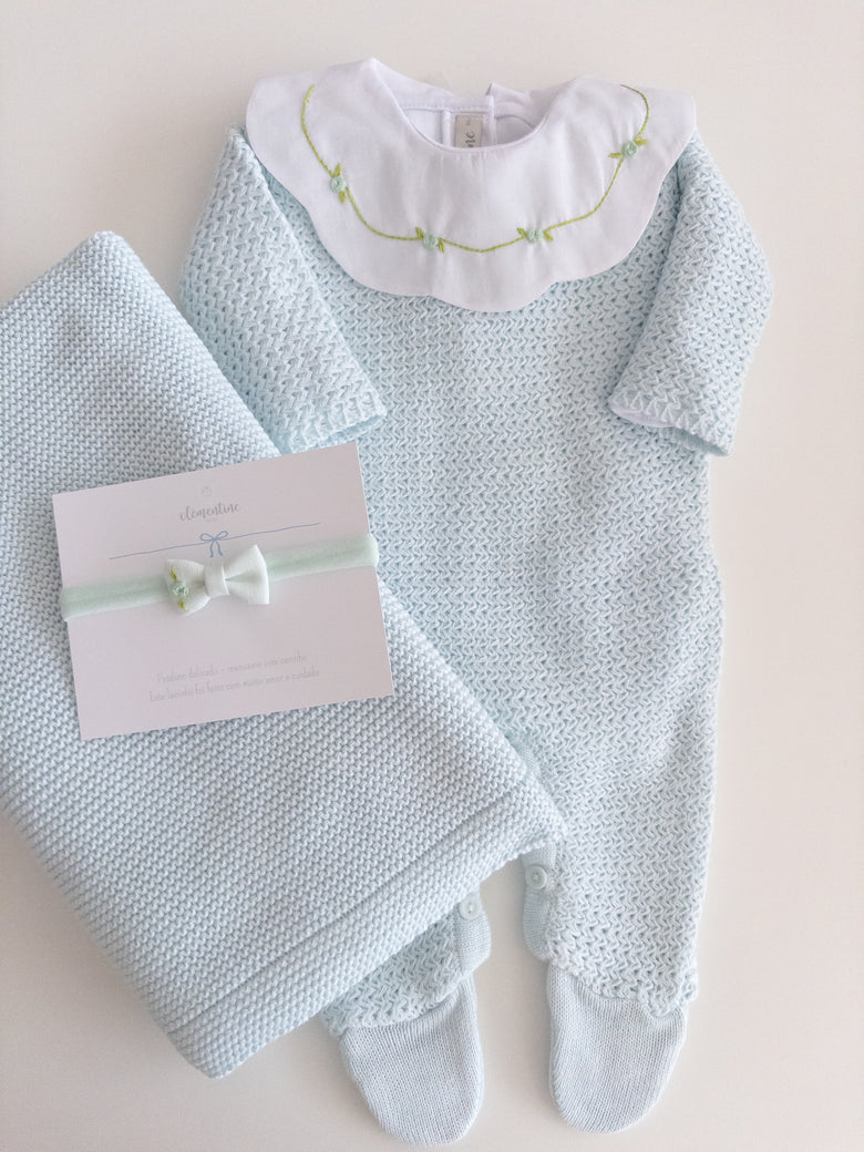 A charming Netuno maternity outfit. A knitted jumpsuit designed with a more open and breathable weave, adding a touch of elegance and sophistication to your baby’s look. Made with soft and breathable fabrics, providing maximum comfort for the newborn. Accompanied by a beautiful cotton bodysuit, featuring a honeycomb collar that adds a touch of sophistication and sweetness, standing out with its intricate pattern reminiscent of honeycombs. Besides adding charm, the collar also provides a classic and elegant appearance.