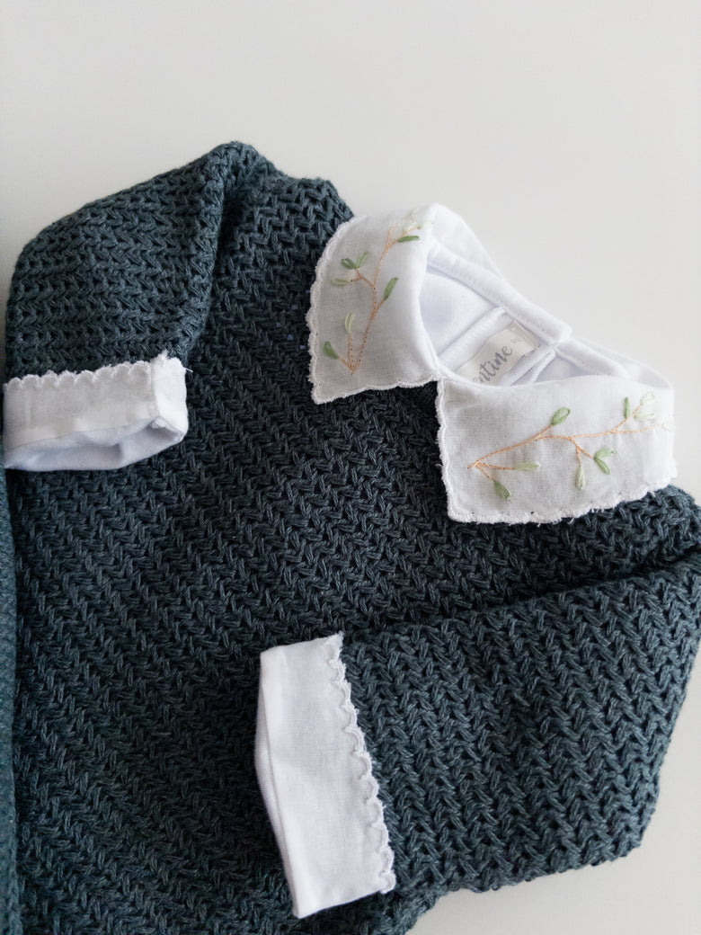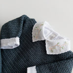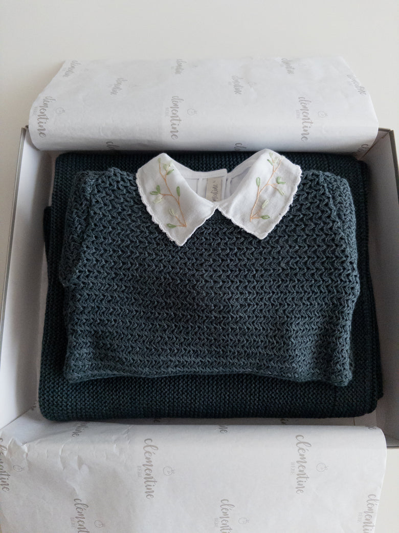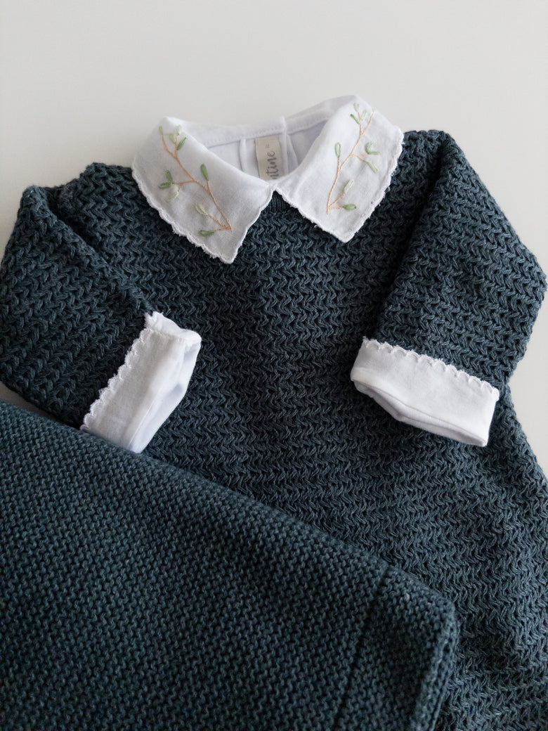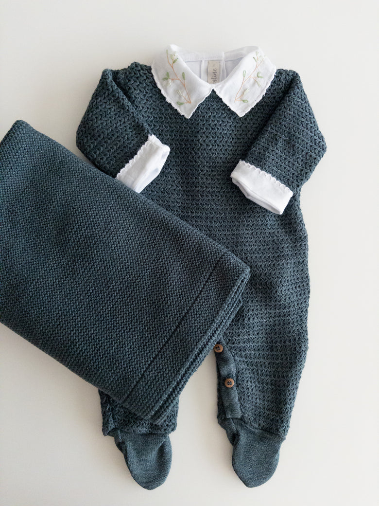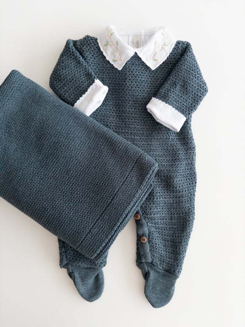 This jumpsuit is the ideal choice to keep your little one cool and comfy. Its airy texture allows the skin to breathe freely, offering a soft and pleasant feel. The bodysuit features delicate hand embroidery on both collars. Comes with a matching knitted blanket.