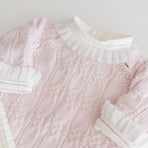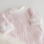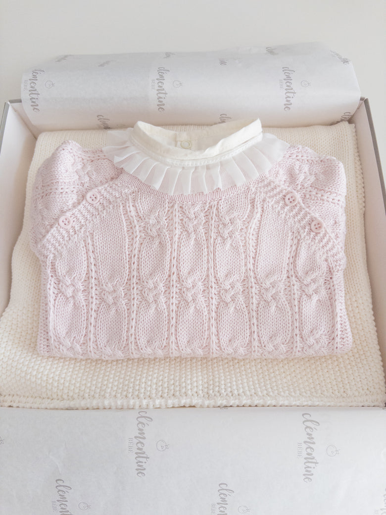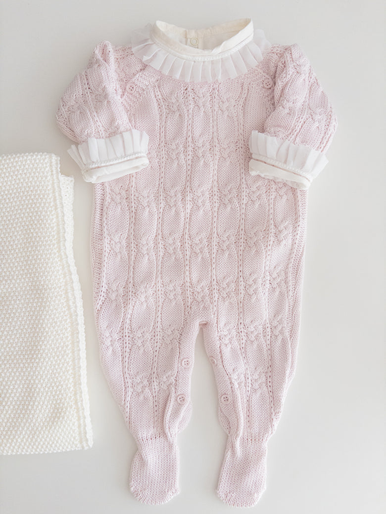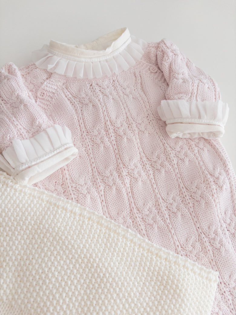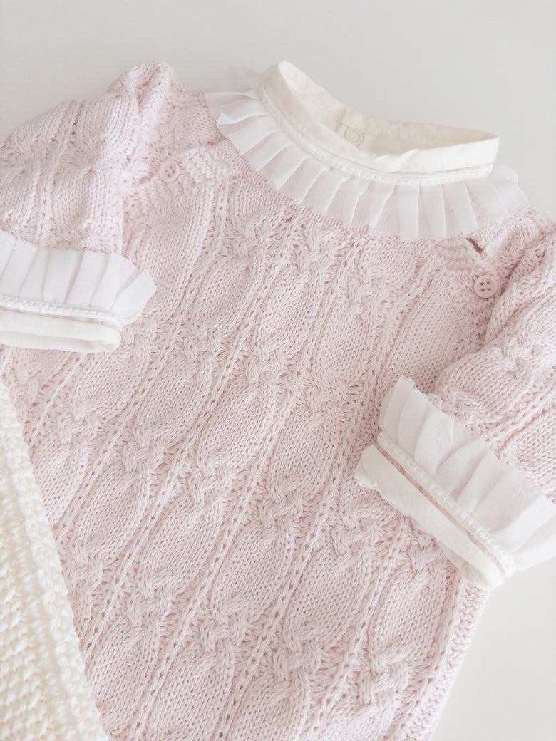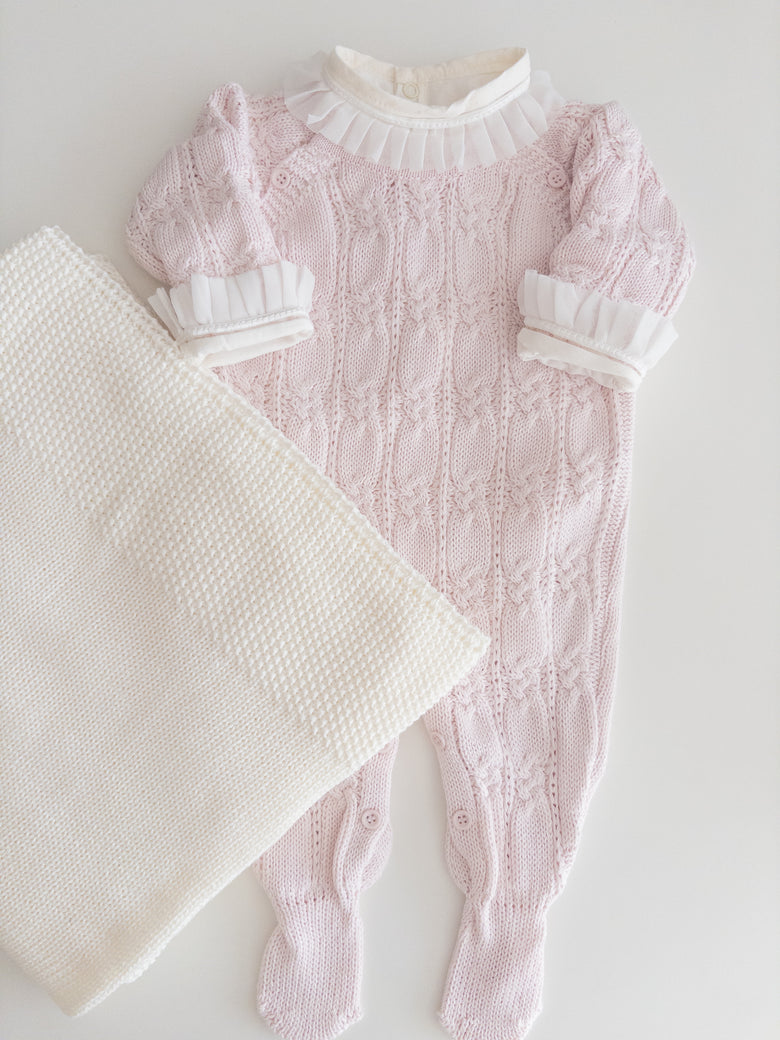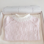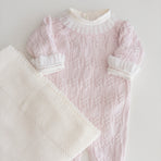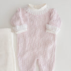 This charming set includes a bodysuit with lace on the collar, adding a special touch of charm and a sense of delicacy. Every detail has been carefully designed to offer not only aesthetic beauty but also functionality and softness for the newborn's sensitive skin. This coming home outfit is perfect for creating unforgettable memories.