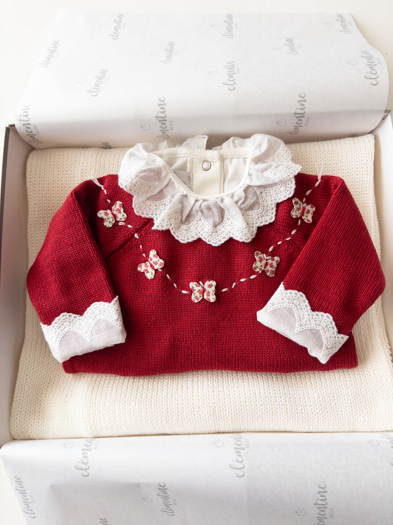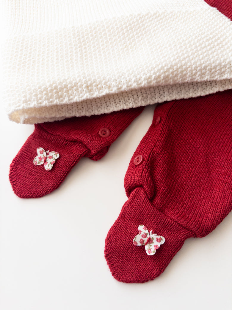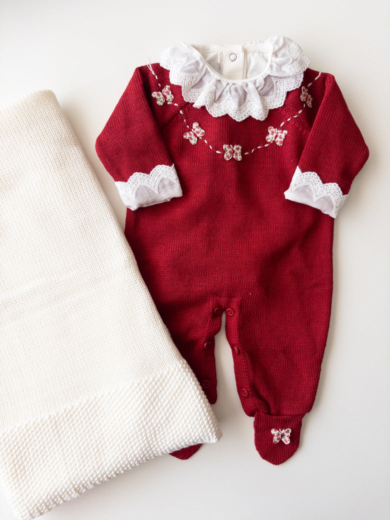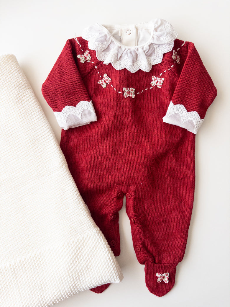 Solar Maternity Going-Home SetA charming red onesie with beautiful butterfly embroidery, adding a delightful touch. Made with soft yarns, the onesie features small buttonholes a...