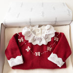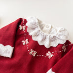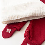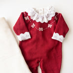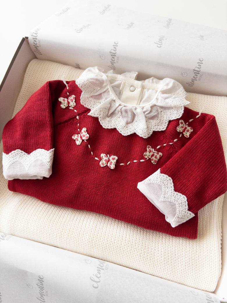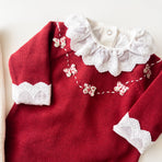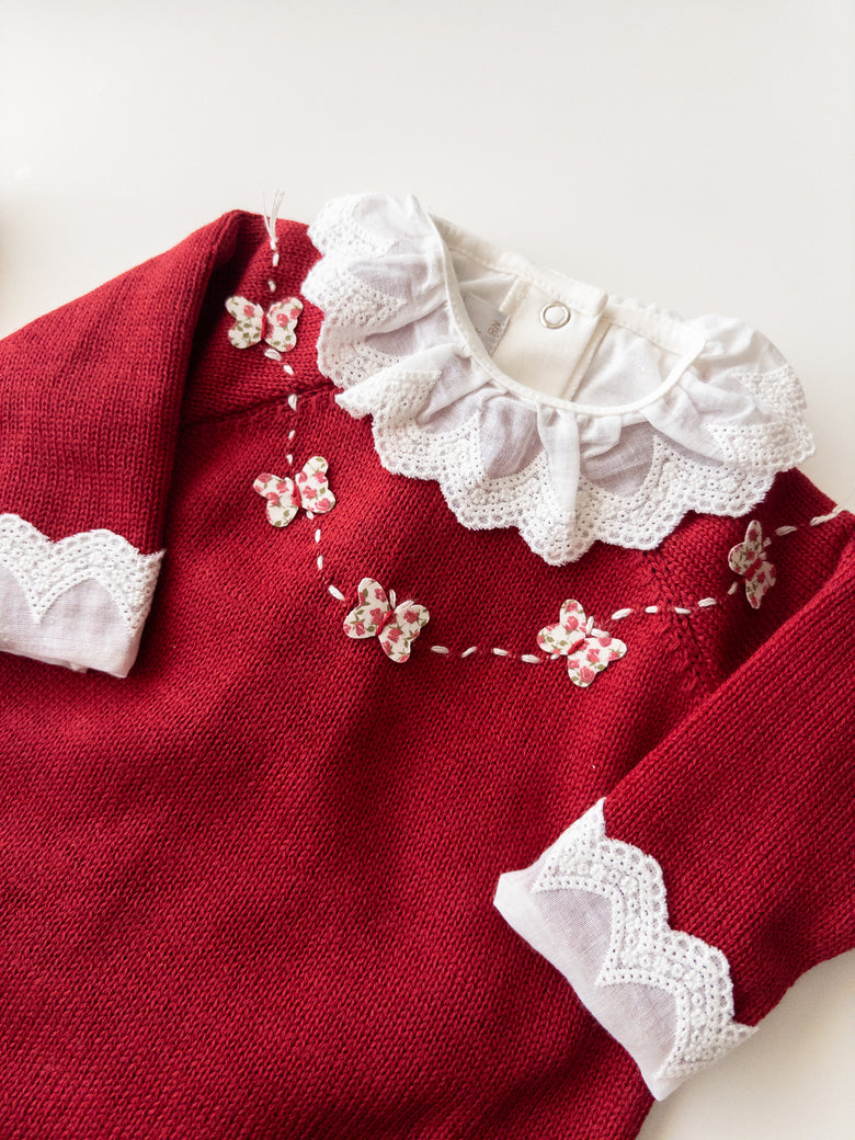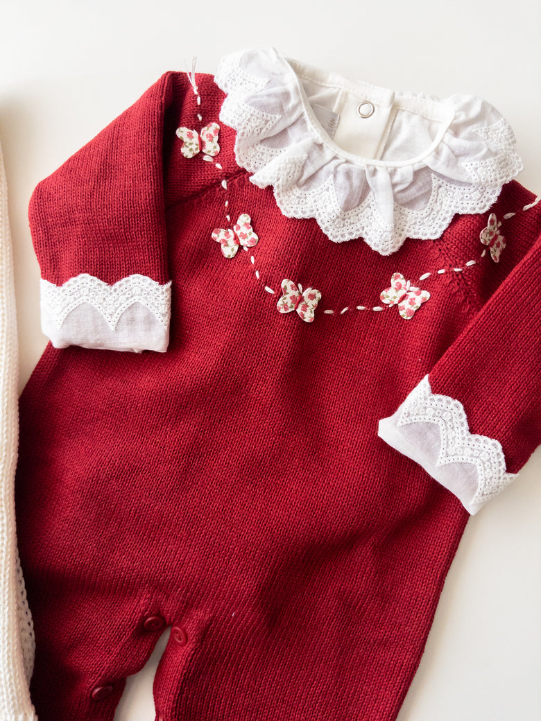 A charming red onesie with beautiful butterfly embroidery, adding a delightful touch. Made with soft yarns, the onesie features small buttonholes at the back for easy dressing. Perfect for keeping little ones cozy and stylish.